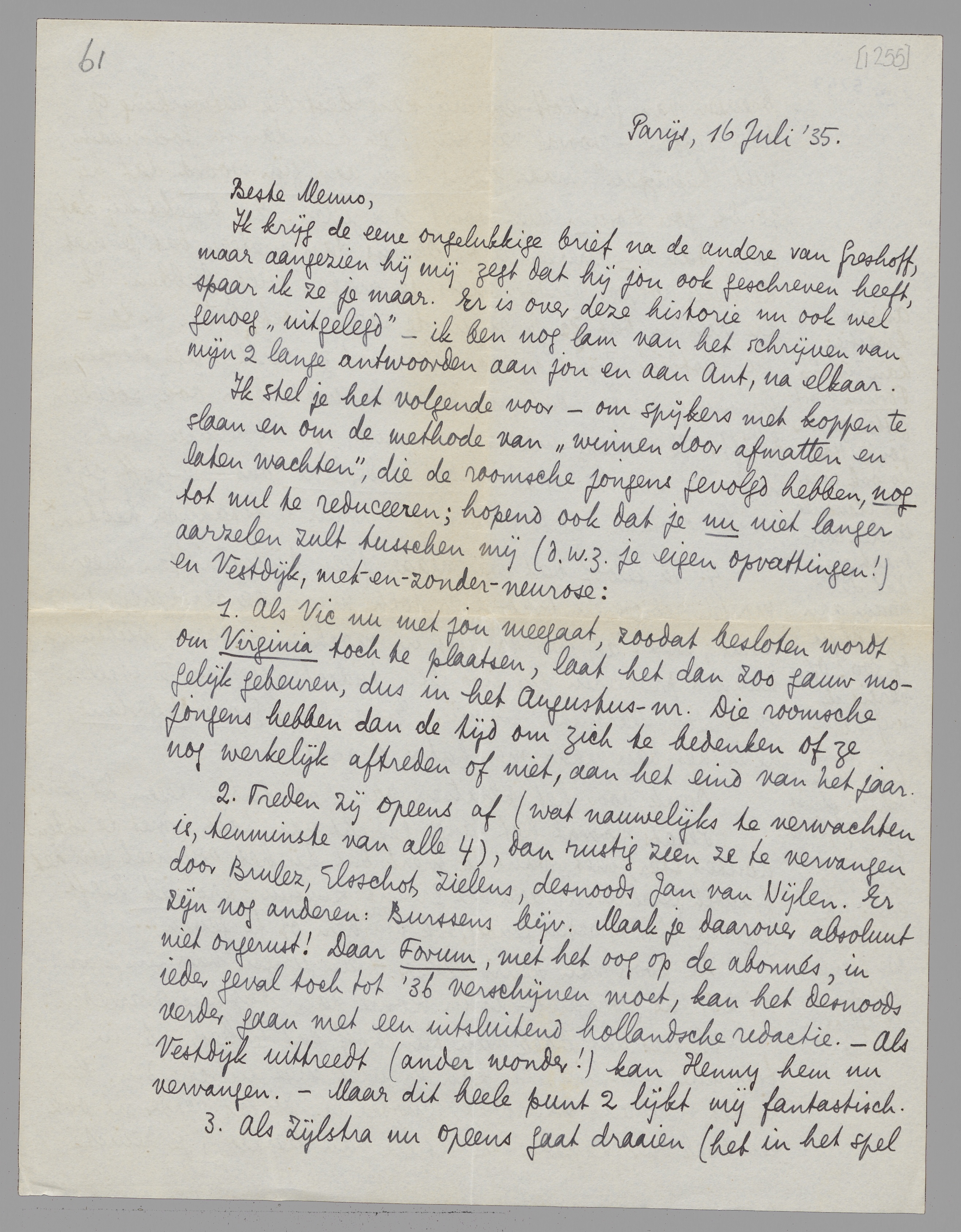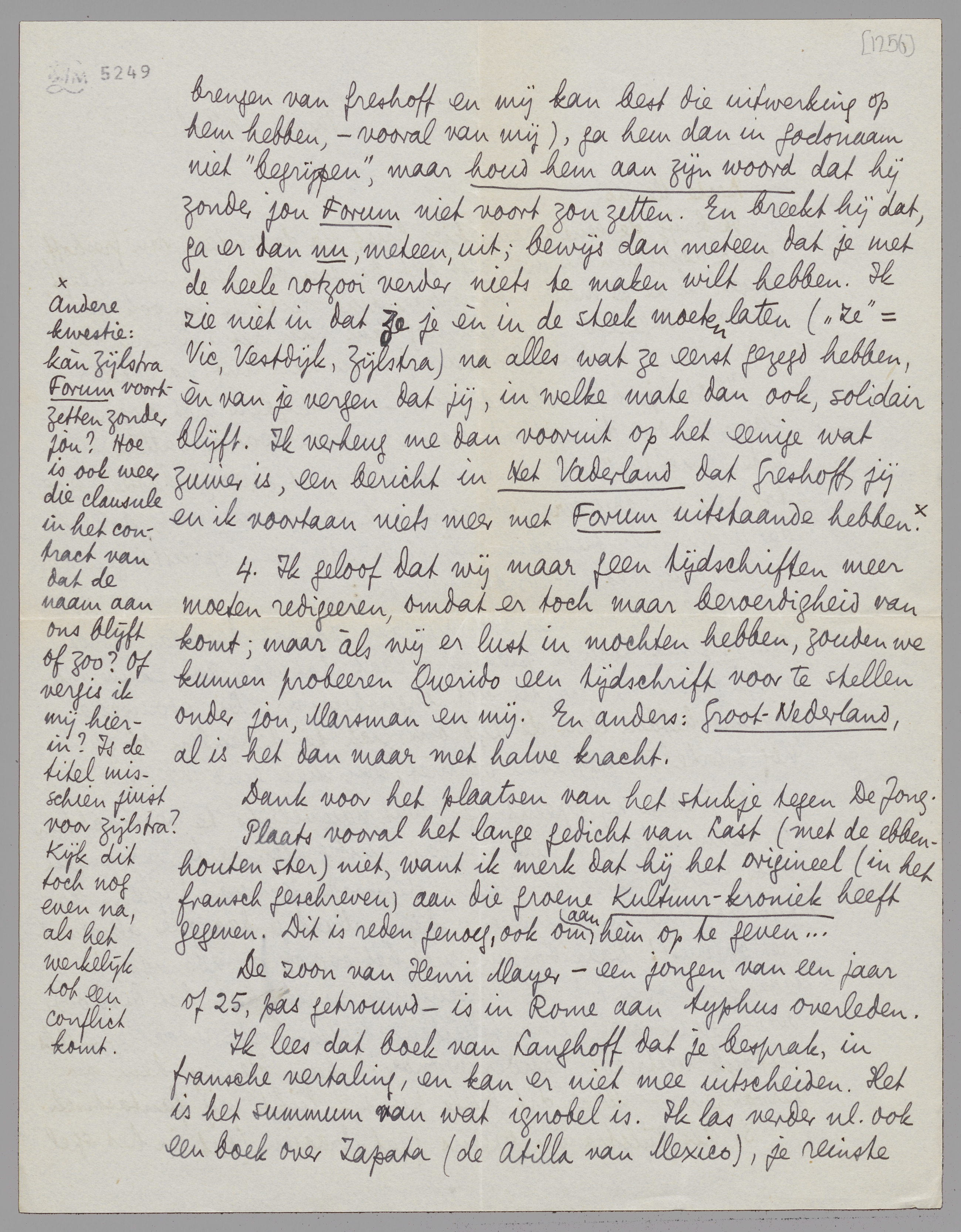 3. Als Zijlstra nu opeens gaat draaien (het in het spel brengen van Greshoff en mij kan best die uitwerking op hem hebben, - vooral van mij), ga hem dan in Godsnaam niet ‘begrijpen’, maar houd hem aan zijn woord dat hij zonder jou Forum niet voort zou zetten. En breekt hij dat, ga er dan nu, meteen, uit; bewijs dan meteen dat je met de heele rotzooi verder niets te maken wilt hebben. Ik zie niet in dat ze je èn in de steek moeten laten (‘ze’ = Vic, Vestdijk, Zijlstra) na alles wat ze eerst gezegd hebben, èn van je vergen dat jij, in welke mate dan ook, solidair blijft. Ik verheug me dan vooruit op het eenige wat zuiver is, een bericht in Het Vaderland dat Greshoff, jij en ik voortaan niets meer met Forum uitstaande hebben [Andere kwestie: kàn Zijlstra Forum voortzetten zonder jou? Hoe is ook weer die clausule in het contract van dat de naam aan ons blijft of zoo? Of vergis ik mij hierin? Is de titel misschien juist voor Zijlstra? Kijk dit toch even na, als het werkelijk tot een conflict komt.]