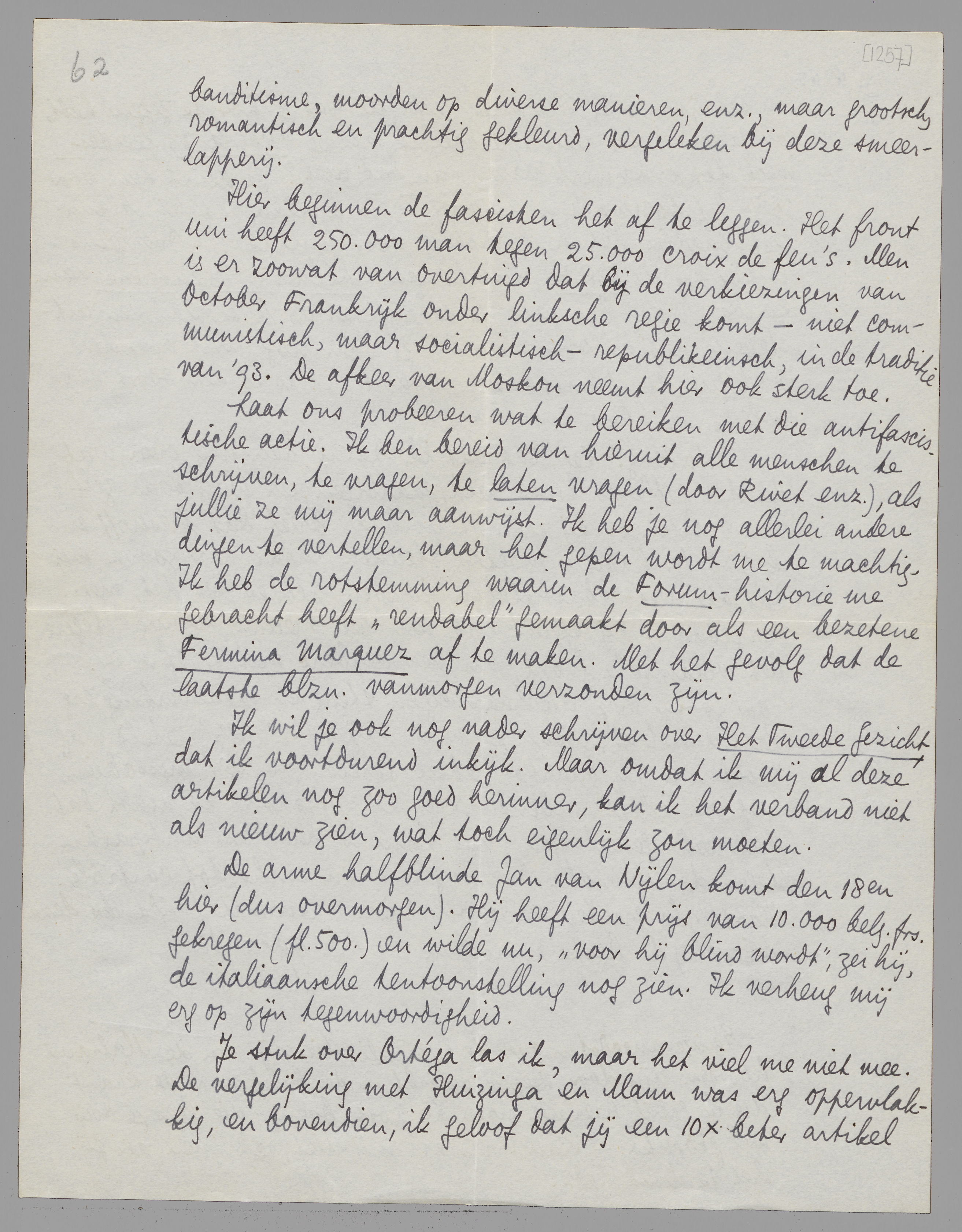 Laat ons probeeren wat te bereiken met die antifascistische actie. Ik ben bereid van hieruit alle menschen te schrijven, te vragen, te laten vragen (door Rivet enz.), als jullie ze mij maar aanwijst. Ik heb je nog allerlei andere dingen te vertellen, maar het gepen wordt me te machtig. Ik heb de rotstemming waarin de Forum-historie me gebracht heeft ‘rendabel’ gemaakt door als een bezetene Fermina Marquez af te maken. Met het gevolg dat de laatste blzn. vanmorgen verzonden zijn.