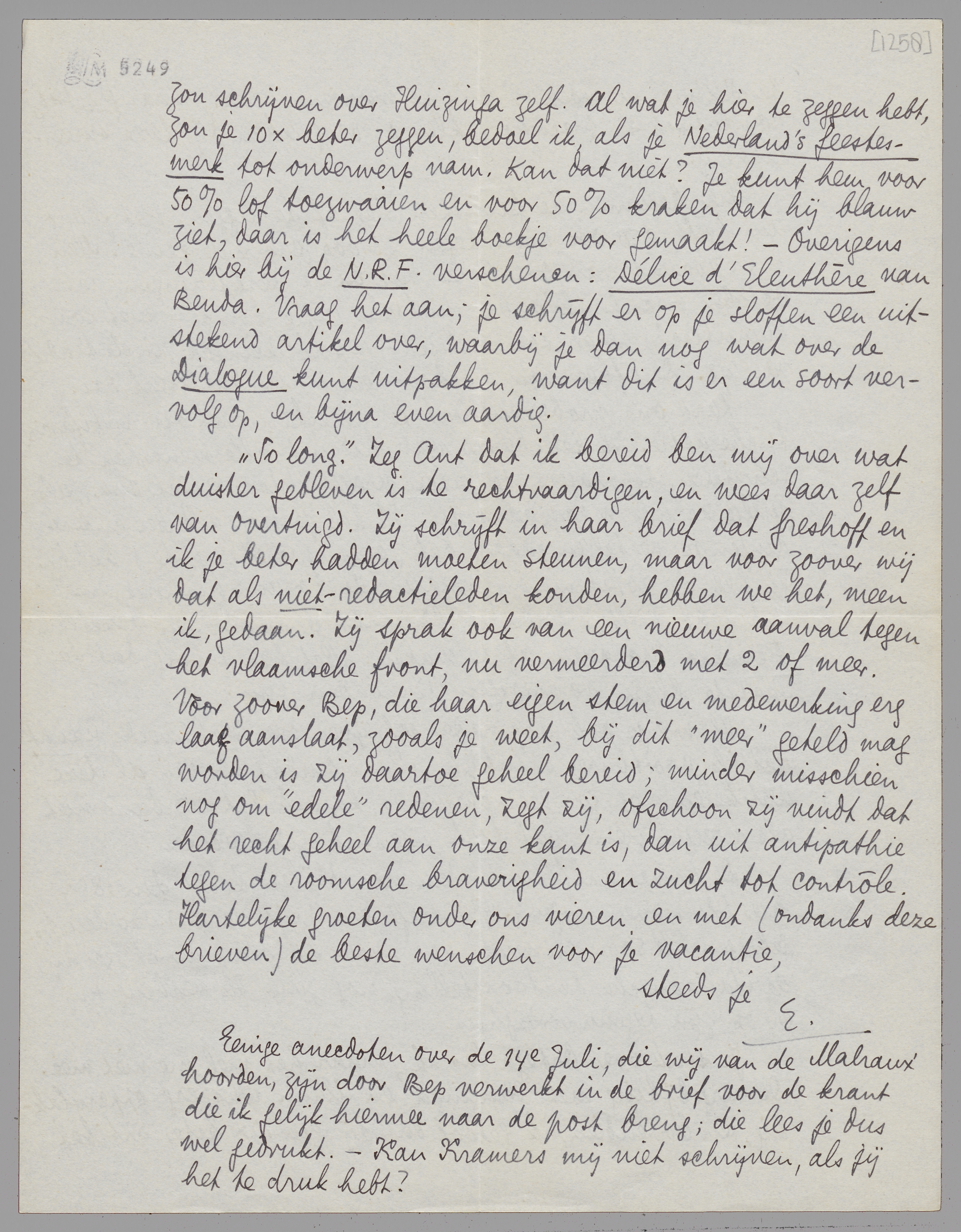 Je stuk over Ortéga las ik, maar het viel me niet mee. De vergelijking met Huizinga en Mann was erg oppervlakkig, en bovendien, ik geloof dat jij een 10 × beter artikel zou schrijven over Huizinga zelf. Al wat je hier te zeggen hebt, zou je 10 × beter zeggen, bedoel ik, als je Nederland's Geestesmerk tot onderwerp nam. Kan dat niet? Je kunt hem voor 50% lof toezwaaien en voor 50% kraken dat hij blauw ziet, daar is het heele boekje voor gemaakt! - Overigens is hier bij de N.R.F. verschenen: Délice d'Eleuthère van Benda. Vraag het aan; je schrijft er op je sloffen een uitstekend artikel over, waarbij je dan nog wat over de Dialogue kunt uitpakken, want dit is er een soort vervolg op, en bijna even aardig.
