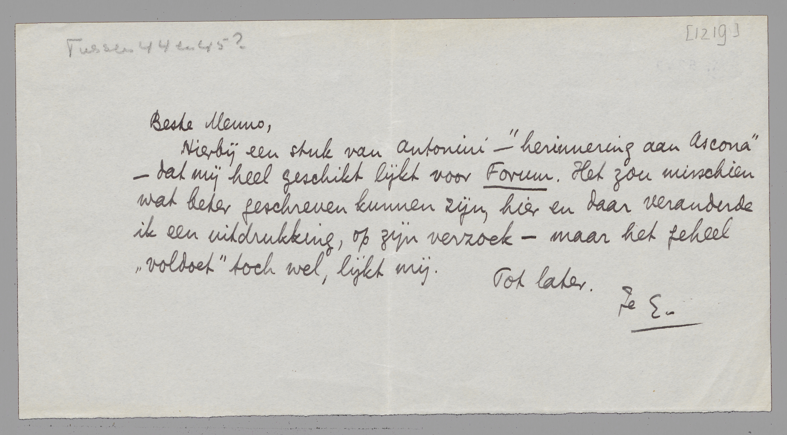 Hierbij een stuk van Antonini - ‘herinnering aan Ascona’ - dat mij heel geschikt lijkt voor Forum. Het zou misschien wat beter geschreven kunnen zijn, hier en daar veranderde ik een uitdrukking, op zijn verzoek - maar het geheel ‘voldoet’ toch wel, lijkt mij.