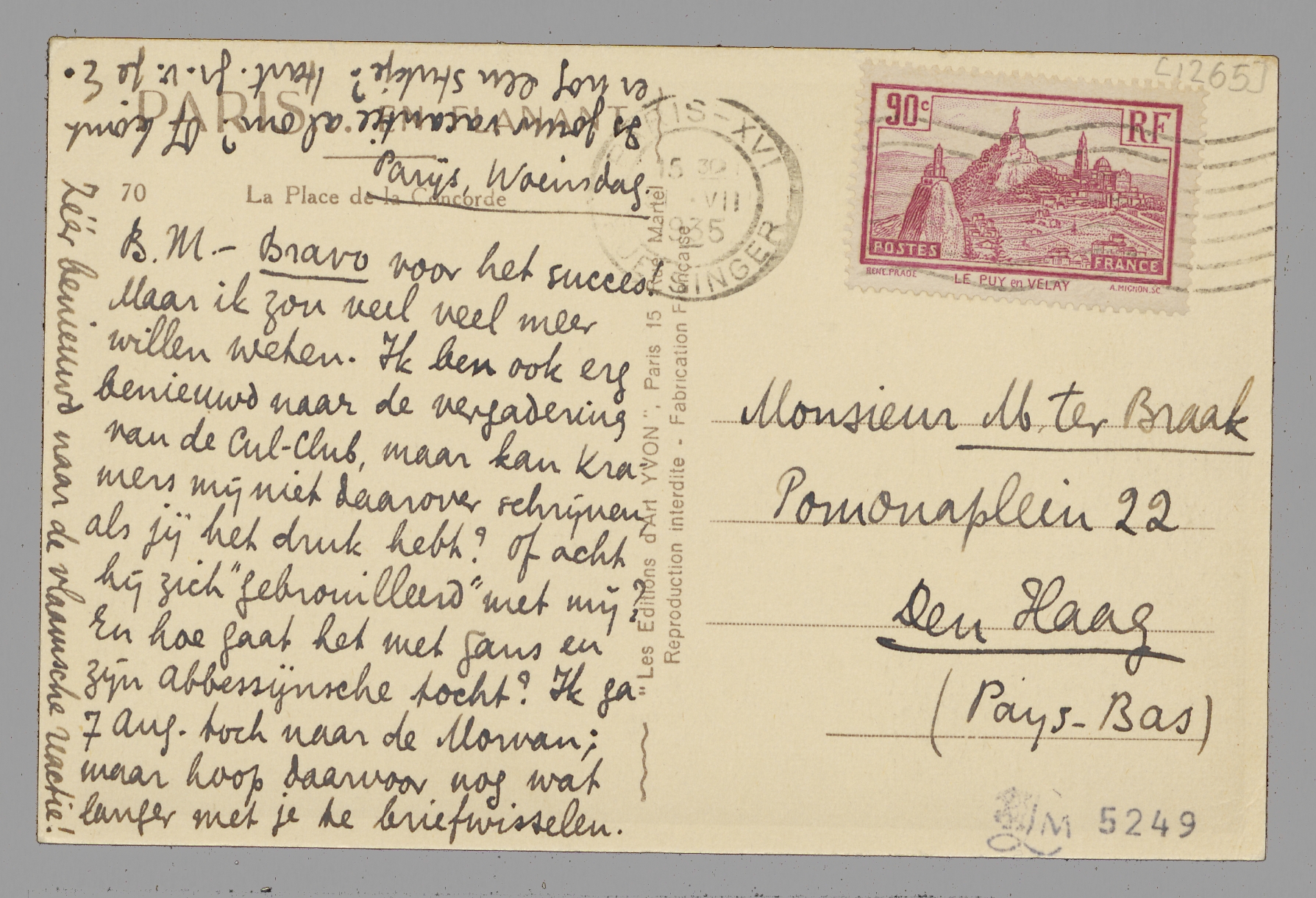 - Bravo voor het succes! Maar ik zou veel meer willen weten. Ik ben erg benieuwd naar de vergadering van de Cul-Club, maar kan Kramers mij niet daarover schrijven, als jij het druk hebt? Of acht hij zich ‘gebrouilleerd’ met mij? En hoe gaat het met Gans en zijn Abbessijnsche tocht? Ik ga 7 Aug. toch naar de Morvan; maar hoop daarvoor nog langer met je te briefwisselen.