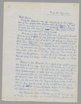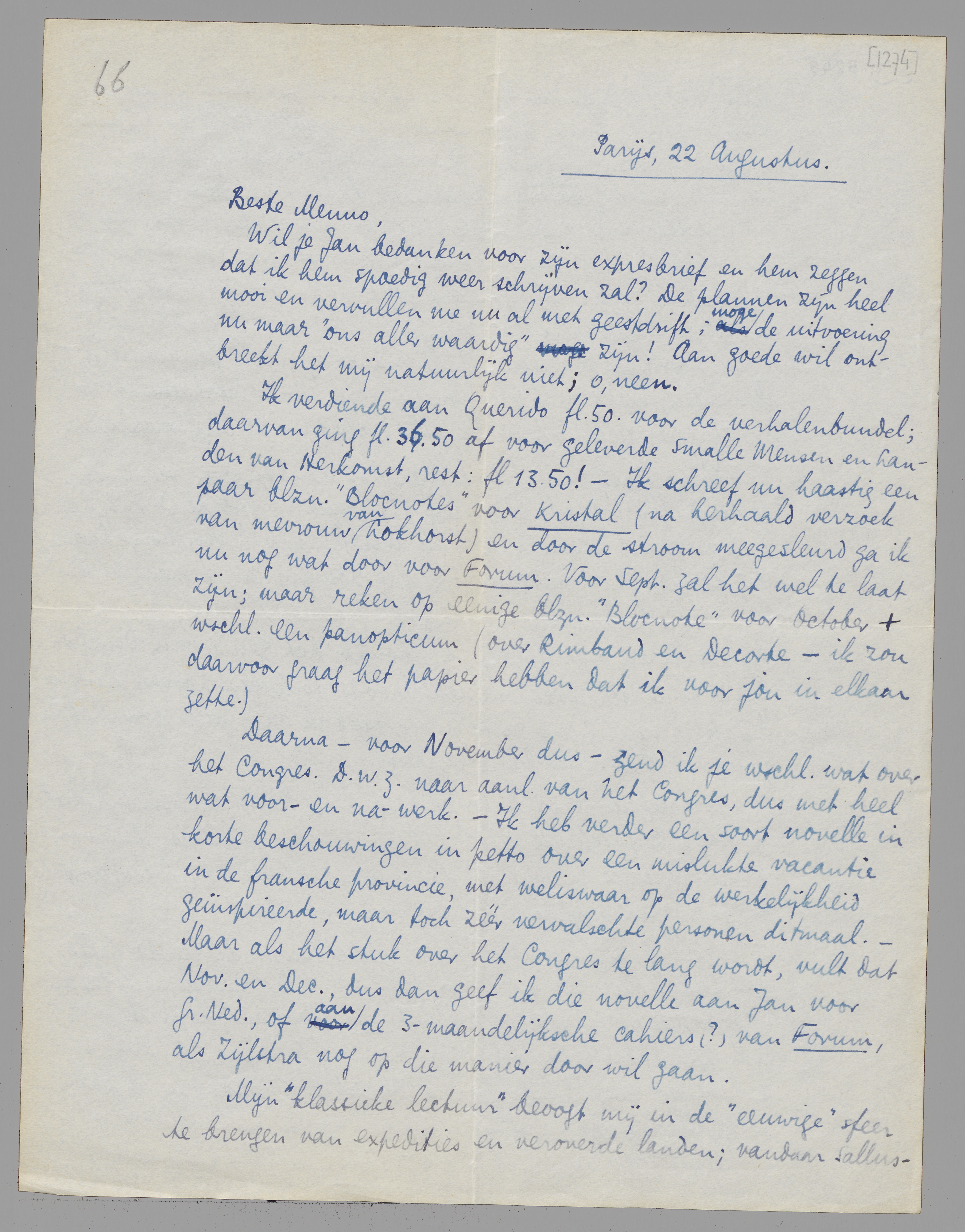 Ik verdiende aan Querido fl. 50. - voor de verhalenbundel; daarvan ging fl. 36.50 af voor geleverde Smalle Mensen en Landen van Herkomst, rest: fl. 13.50! - Ik schreef nu haastig een paar blzn. Blocnotes voor Kristal (na herhaald verzoek van mevrouw van Lokhorst) en door de stroom meegesleurd ga ik nu nog wat door voor Forum. Voor Sept. zal het wel te laat zijn; maar reken op eenige blzn. Blocnote voor October + wschl. een panopticum (over Rimbaud en Decorte - ik zou daarvoor graag het papier hebben dat ik voor jou in elkaar zette.)