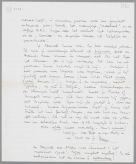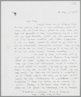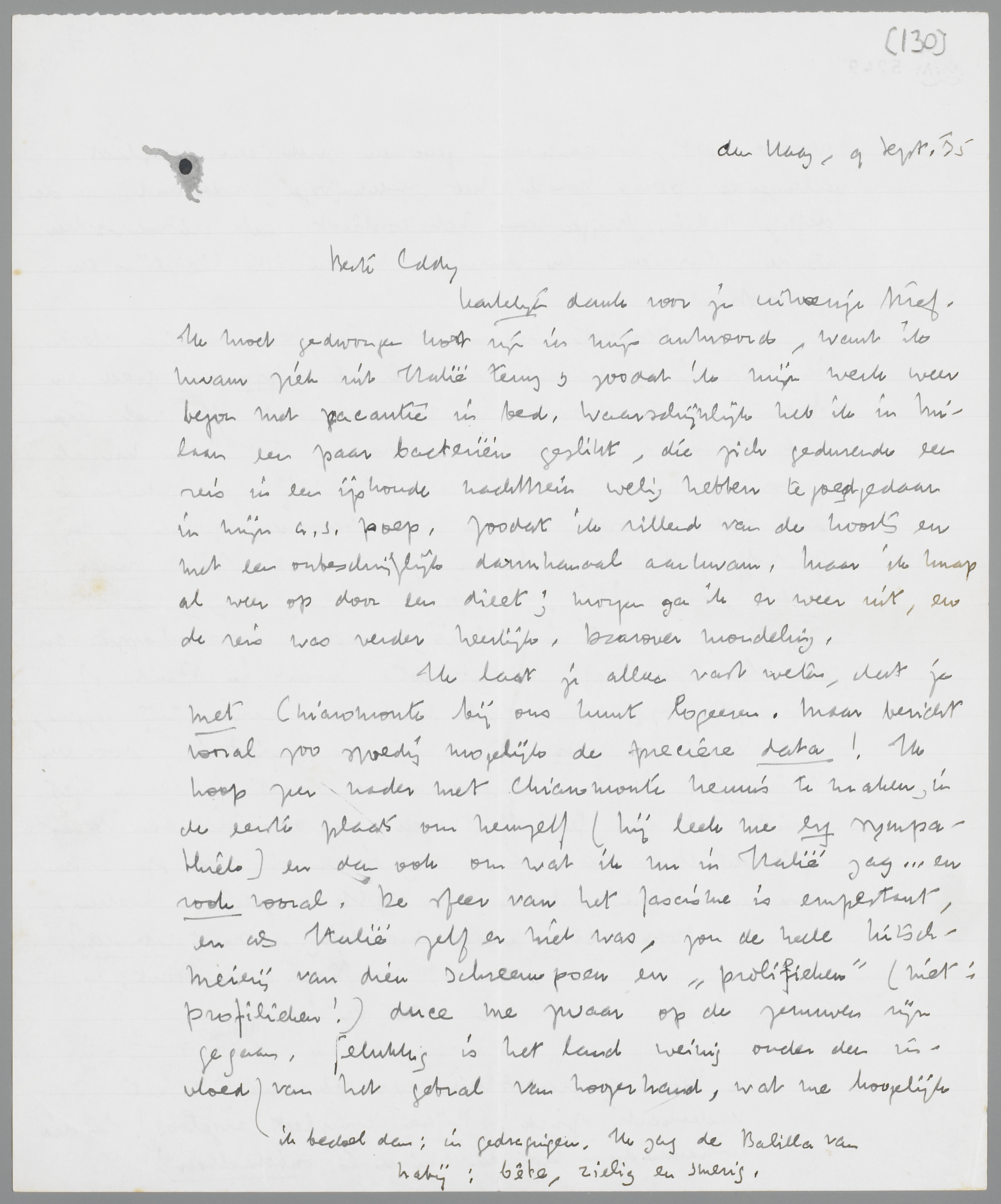 Hartelijk dank voor je uitvoerige brief. Ik moet gedwongen kort zijn in mijn antwoord, want ik kwam ziek uit Italië terug, zoodat ik mijn werk weer begon met vacantie in bed. Waarschijnlijk heb ik in Milaan een paar bacteriën geslikt, die zich gedurende een reis in een ijskoude nachttrein welig hebben tegoedgedaan in mijn a.s. poep, zoodat ik rillend van de koorts en met een onbeschrijflijk darmkanaal aankwam. Maar ik knap al weer op door een dieet; morgen ga ik er weer uit, en de reis was verder heerlijk. Daarover mondeling.