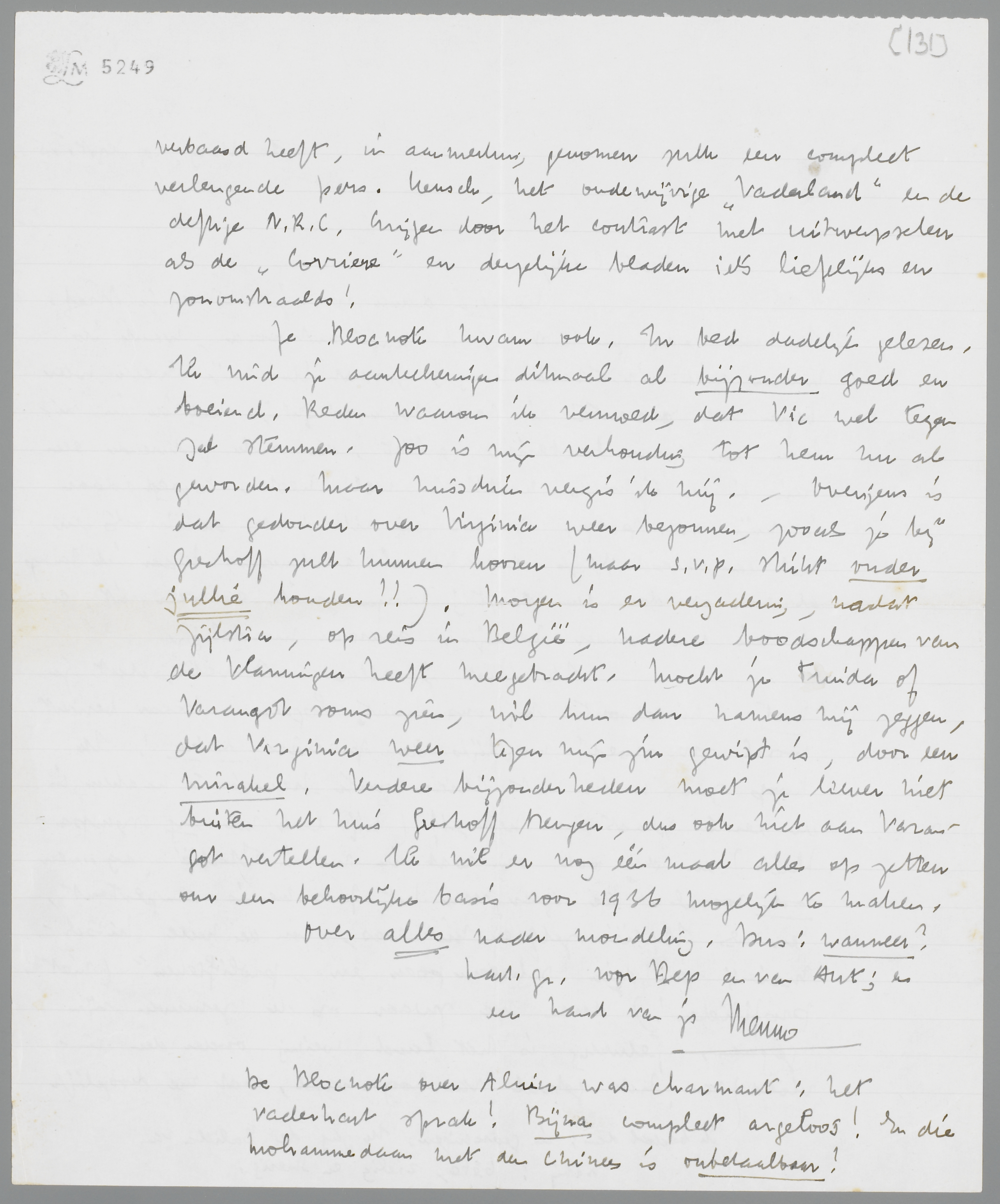 Je Blocnote kwam ook. In bed dadelijk gelezen. Ik vind je aanteekeningen ditmaal al bijzonder goed en boeiend. Reden waarom ik vermoed, dat Vic wel tegen zal stemmen. Zoo is mijn verhouding tot hem nu al geworden. Maar misschien vergis ik mij. Overigens is dat gedonder over Virginia weer begonnen, zooals je bij Greshoff zult kunnen hooren (maar s.v.p. strikt onder jullie houden!!). Morgen is er vergadering, nadat Zijlstra, op reis in België, nadere boodschappen van de Vlamingen heeft meegebracht. Mocht je Truida of Varangot soms zien, wil hun dan namens mij zeggen, dat Virginia weer tegen mijn zin gewipt is, door een mirakel. Verdere bijzonderheden moet je liever niet buiten het huis Greshoff brengen, dus ook niet aan Varangot vertellen. Ik wil er nog één maal alles op zetten om een behoorlijke basis voor 1936 mogelijk te maken.