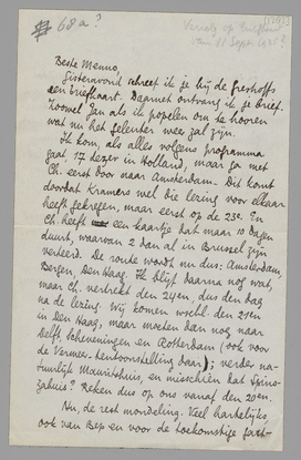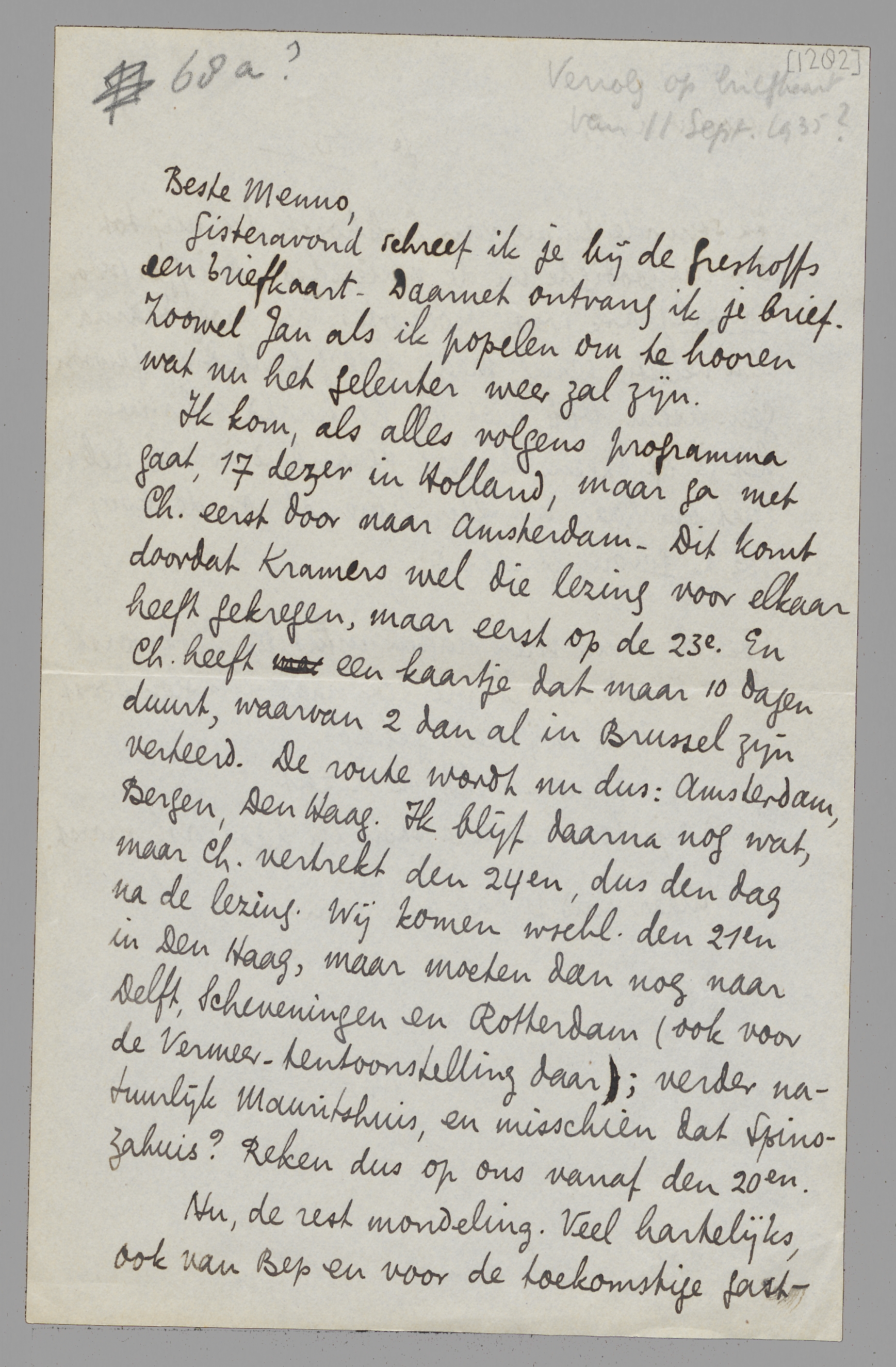 Ik kom, als alles volgens programma gaat, 17 dezer in Holland, maar ga met Ch. eerst door naar Amsterdam - Dit komt doordat Kramers wel die lezing voor elkaar heeft gekregen, maar eerst op de 23e. En Ch. heeft een kaartje dat maar 10 dagen duurt, waarvan 2 dan al in Brussel zijn verteerd. De route wordt nu dus: Amsterdam, Bergen, Den Haag. Ik blijf daarna nog wat, maar Ch. vertrekt den 24en, dus den dag na de lezing. Wij komen wschl. den 21en in Den Haag, maar moeten dan nog naar Delft, Scheveningen en Rotterdam (ook voor de Vermeer-tentoonstelling daar); verder natuurlijk Mauritshuis, en misschien dat Spinozahuis? Reken dus op ons vanaf den 20en.