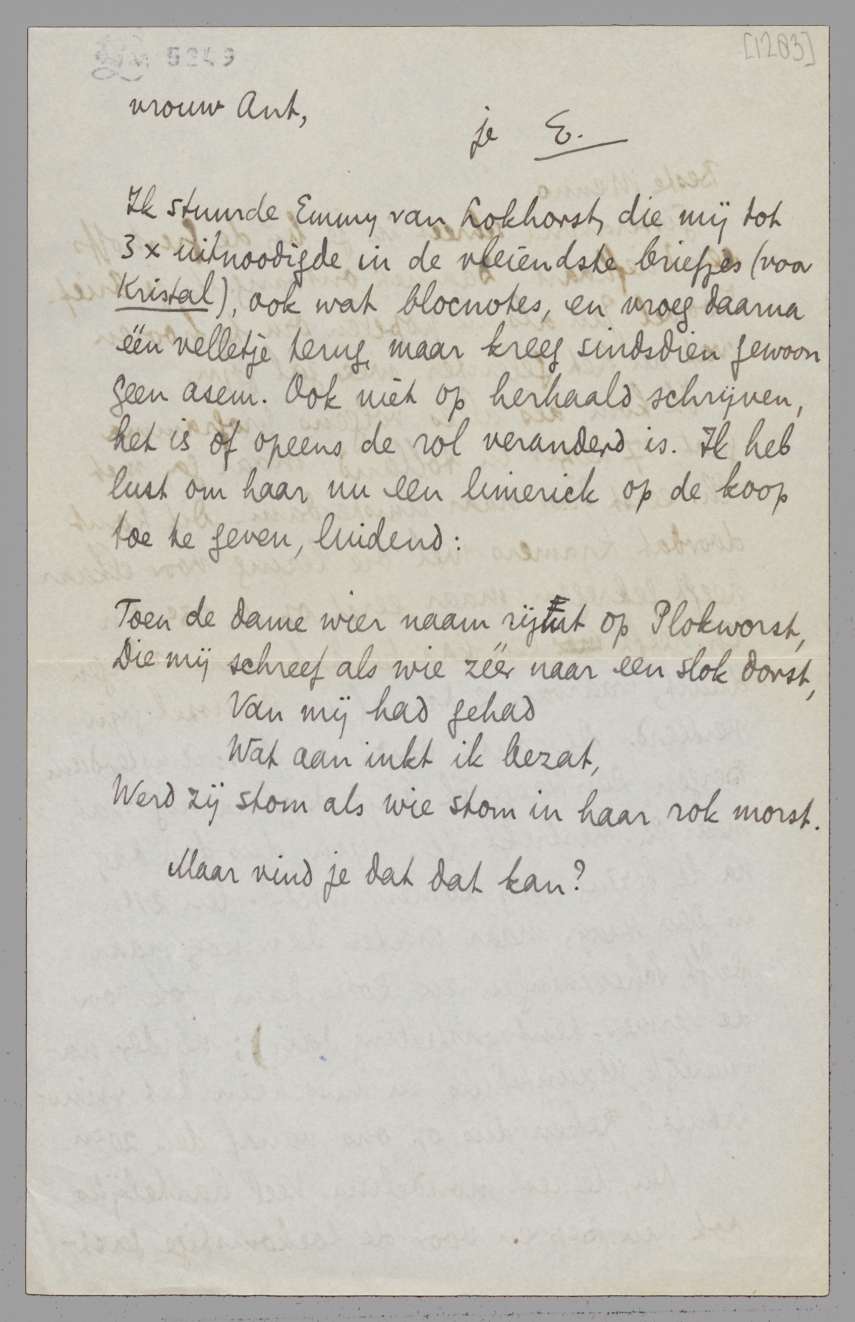 Ik stuurde Emmy van Lokhorst, die mij tot 3 × uitnoodigde in de vleiendste briefjes (voor Kristal), ook wat blocnotes, en vroeg daarna één velletje terug, maar kreeg sindsdien gewoon geen asem. Ook niet op herhaald schrijven, het is of opeens de rol veranderd is. Ik heb lust om haar nu een limerick op de koop toe te geven, luidend:
