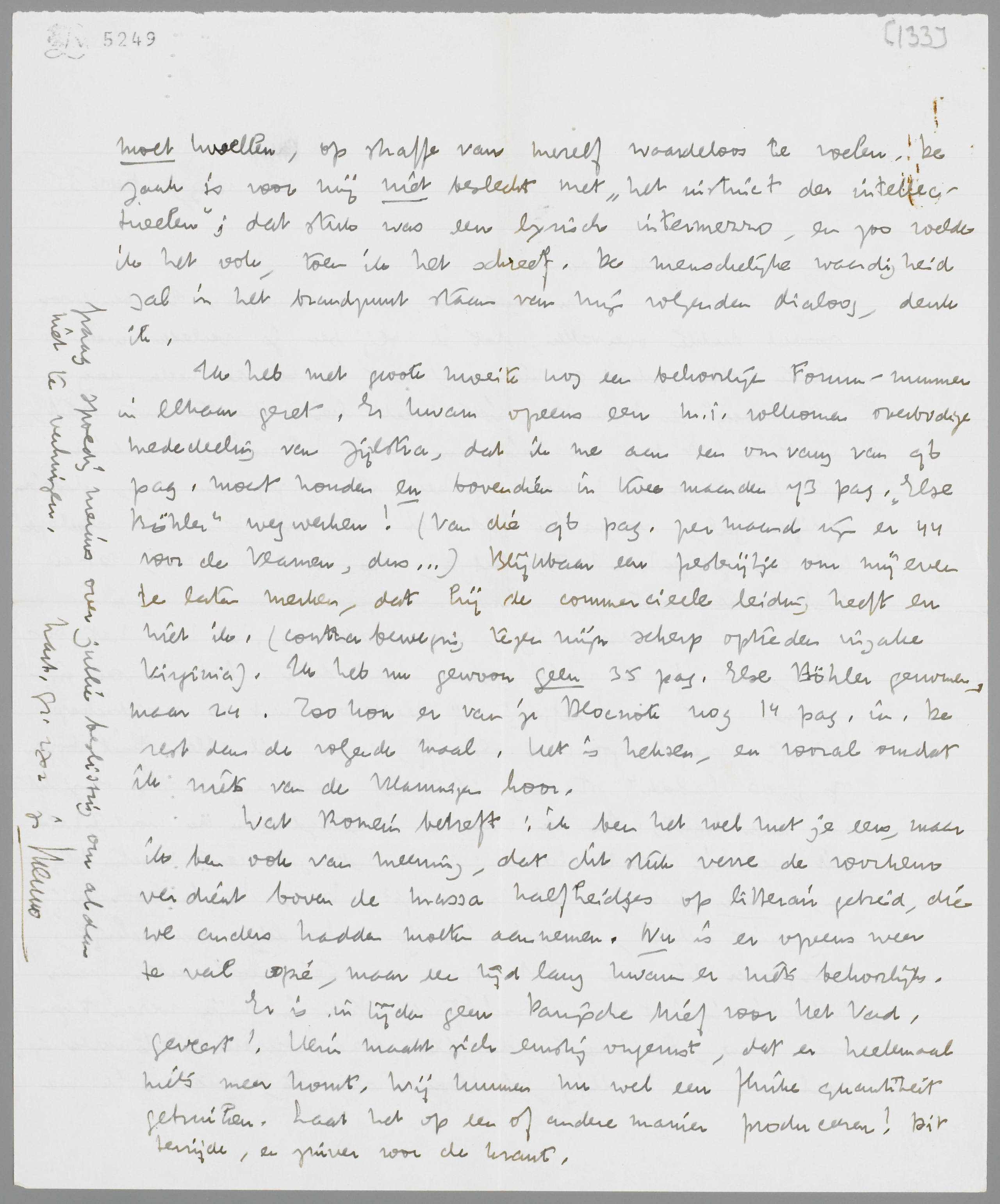 Ik heb met groote moeite nog een behoorlijk Forum-nummer in elkaar gezet. Er kwam opeens een m.i. volkomen overbodige mededeeling van Zijlstra, dat ik me aan een omvang van 96 pag. moet houden en bovendien in twee maanden 37 pag. Else Böhler wegwerken! (van die 96 pag. per maand zijn er 44 voor de Vlamen, dus...) Blijkbaar een pesterijtje om mij even te laten merken, dat hij de commercieele leiding heeft en niet ik. (contrabeweging tegen mijn scherp optreden inzake Virginia). Ik heb nu gewoon geen 35 pag. Else Böhler genomen, maar 24. Zoo kon er van je Blocnote nog 14 pag. in. De rest dan de volgende maal. Het is heksen, en vooral omdat ik niets van de Vlamingen hoor.