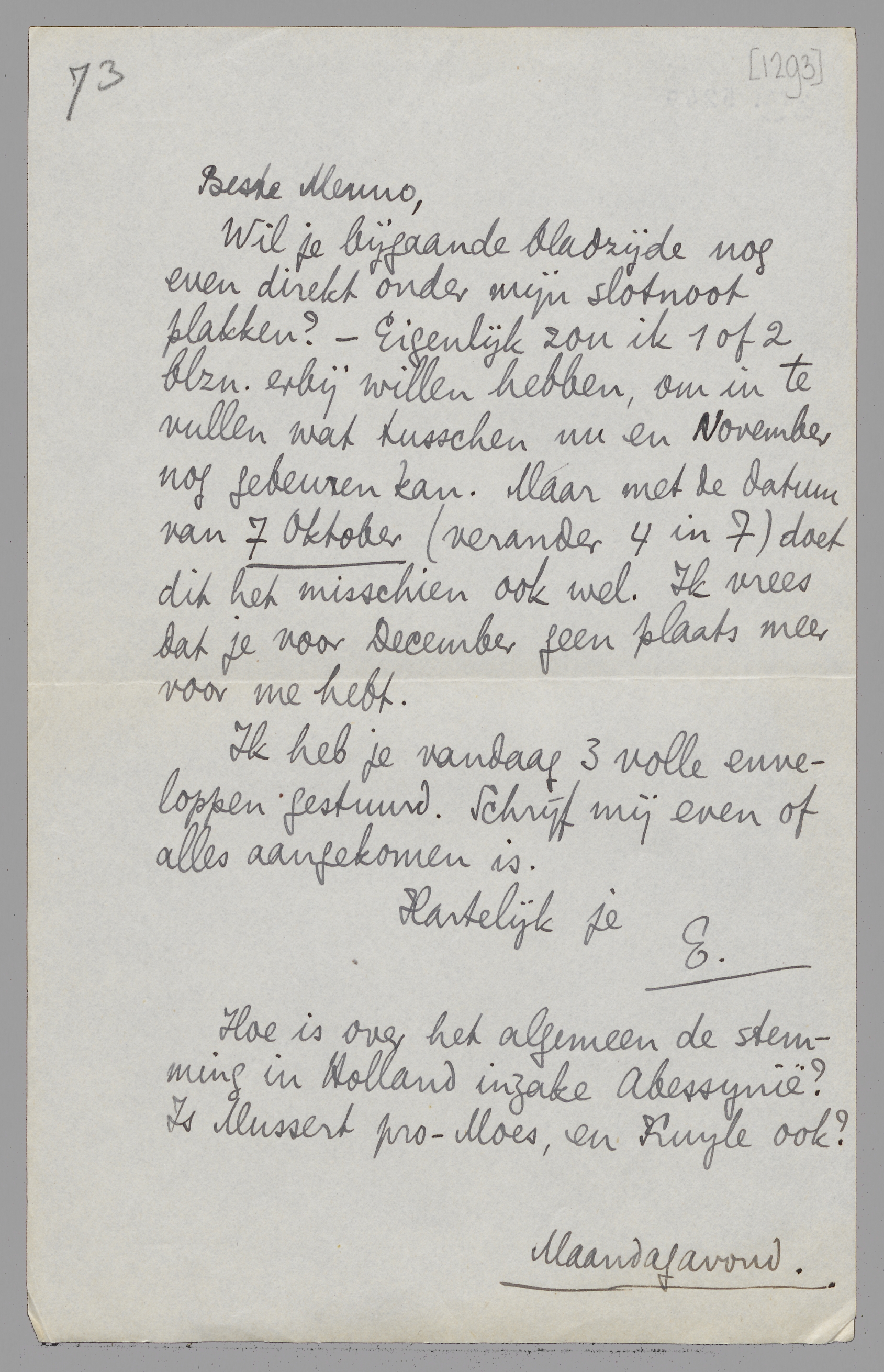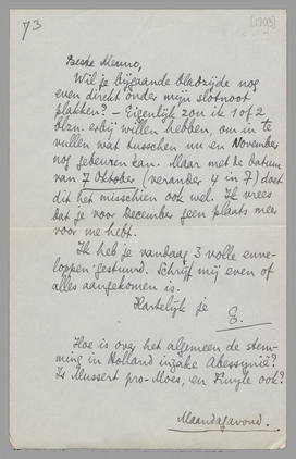 Wil je bijgaande bladzijde nog even direkt onder mijn slotnoot plakken? - Eigenlijk zou ik 1 of 2 blzn. erbij willen hebben, om in te vullen wat tusschen nu en November nog gebeuren kan. Maar met de datum van 7 October (verander 4 in 7) doet dit het misschien ook wel. Ik vrees dat je voor December geen plaats meer voor me hebt.