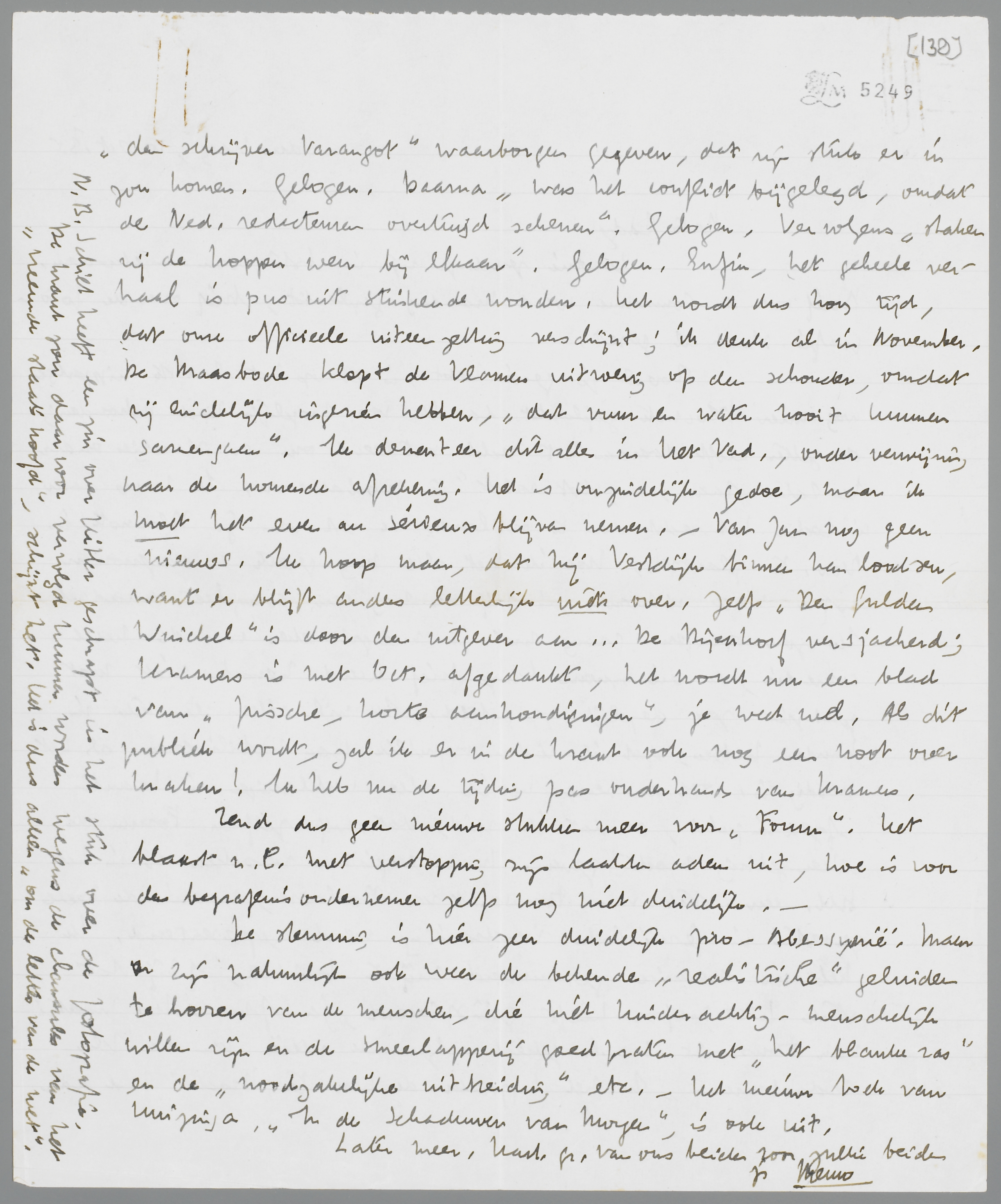 Zooals je gezien hebt, is er op het laatste nippertje nog meer Blocnote geplaatst dan ik voor mogelijk had gehouden; de zetter heeft daaraan het recht ontleend om er sterretjes onder te laten staan, en ‘slot volgt’ te proclameeren. Ik hoop daar intusschen het recht aan te ontleenen de rest van je Blocnote in Nov. te plaatsen. Hoe ik met alle nog gezette en aangenomen copie moet uitkomen, is mij nu nog een compleet raadsel. Ik zou overigens graag met je meegrinniken over de heele comedie, en die zware lange brief werd heusch niet met pleizier zoo degelijk opgesteld. Ik wil alleen een stuk in handen hebben, dat ik ieder oogenblik kan mobiliseeren, als het noodig is. Tot dusverre heb ik alle verklaringen in kranten afgewimpeld, omdat ik vind, dat wij zelf in Forum de uiteenzetting moeten geven. Maar eergisteren verscheen er in het Hbl. een stuk van Toussaint van Boelaere, waarin de heele quaestie in jezuïetische verdraaiing werd gepresenteerd. Ik heb nu Maurice gesommeerd mij te berichten, of hij dat stuk kletsmajoor heeft geïnspireerd, ja of neen. Het praatje van Toussaint is n.l. geheel volgens de ideeën van de Vl. redacteuren. ‘In het bijzonder de heer ter Braak’ had aan ‘den schrijver Varangot’ waarborgen gegeven, dat zijn stuk er in zou komen. Gelogen. Daarna ‘was het conflict bijgelegd, omdat de Ned. redacteuren overtuigd schenen’. Gelogen. Vervolgens ‘staken zij de koppen weer bij elkaar’. Gelogen. Enfin, het geheele verhaal is pus uit stinkende wonden. Het wordt dus hoog tijd, dat onze officieele uiteenzetting verschijnt; ik denk al in November. De Maasbode klopt de Vlamen uitvoerig op den schouder, omdat zij eindelijk ingezien hebben, ‘dat vuur en water nooit kunnen samengaan’. Ik dementeer dit alles in Het Vad., onder verwijzing naar de komende afrekening. Het is onzindelijk gedoe, maar ik moet het even au serieux blijven nemen. - Van Jan nog geen nieuws. Ik hoop maar, dat hij Vestdijk binnen kan loodsen, want er blijft anders letterlijk niets over. Zelfs Den Gulden Winckel is door den uitgever aan... De Bijenkorf versjacherd; Kramers is met Oct. afgedankt, het wordt nu een blad van ‘frissche, korte aankondigingen’, je weet wel. Als dit publiek wordt, zal ik er in de krant ook nog een noot over kraken! Ik heb nu de tijding pas onderhands van Kramers.