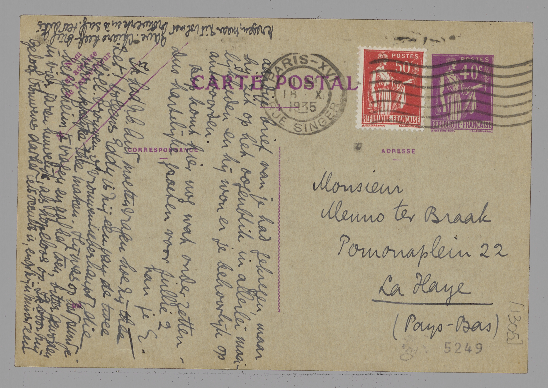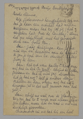 [E.d.P.-d.R.:] Ik had n.b. Ant moeten vragen hoe zij thee zet! Volgens Eddy is zij een van de twee Holl. vrouwen of vrouwen-ueberhaupt, die verrukkelijke thee maken. Hij was op het punt je het geheim te vragen en gaf het toen, bitter geworden in vier jaren huwelijk, als hopeloos op. Ik voor mij geloof trouwens dat het iets occults is, en op zijn minst een gave. Chiaro heeft brief gekregen, maar zit vol met rotwerk en is suf. Het was gezellig jullie te zien.