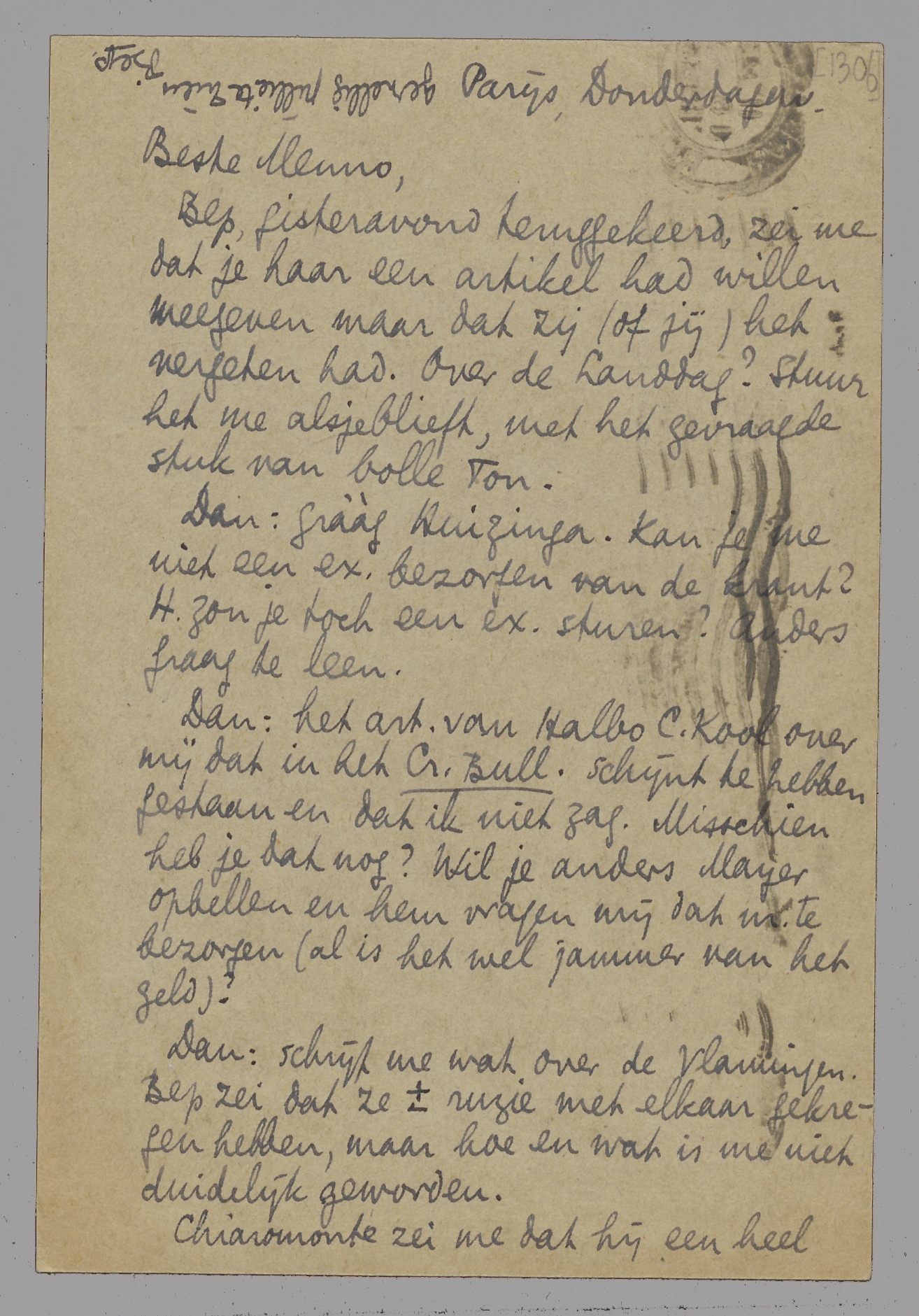 Dan: Gráág Huizinga. Kan je me niet een ex. bezorgen van de krant? H. zou je toch een ex. sturen? Anders graag te leen.