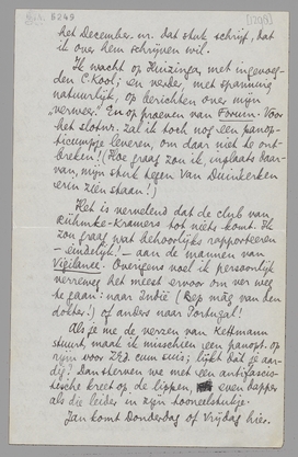 Wat doet Vestdijk? Heeft hij - o, schrikbeeld! - het geld kunnen vinden, en willen uitgeven, om naar Brussel te gaan? Wil je hem vragen mij De Bruine Vriend te sturen, of kan jij mij die bezorgen? Als V. met 1936 in de redactie van Gr. Ned. plaats neemt, zal ik zorgen dat ik voor het December - nr. dat stuk schrijf, dat ik over hem schrijven wil.