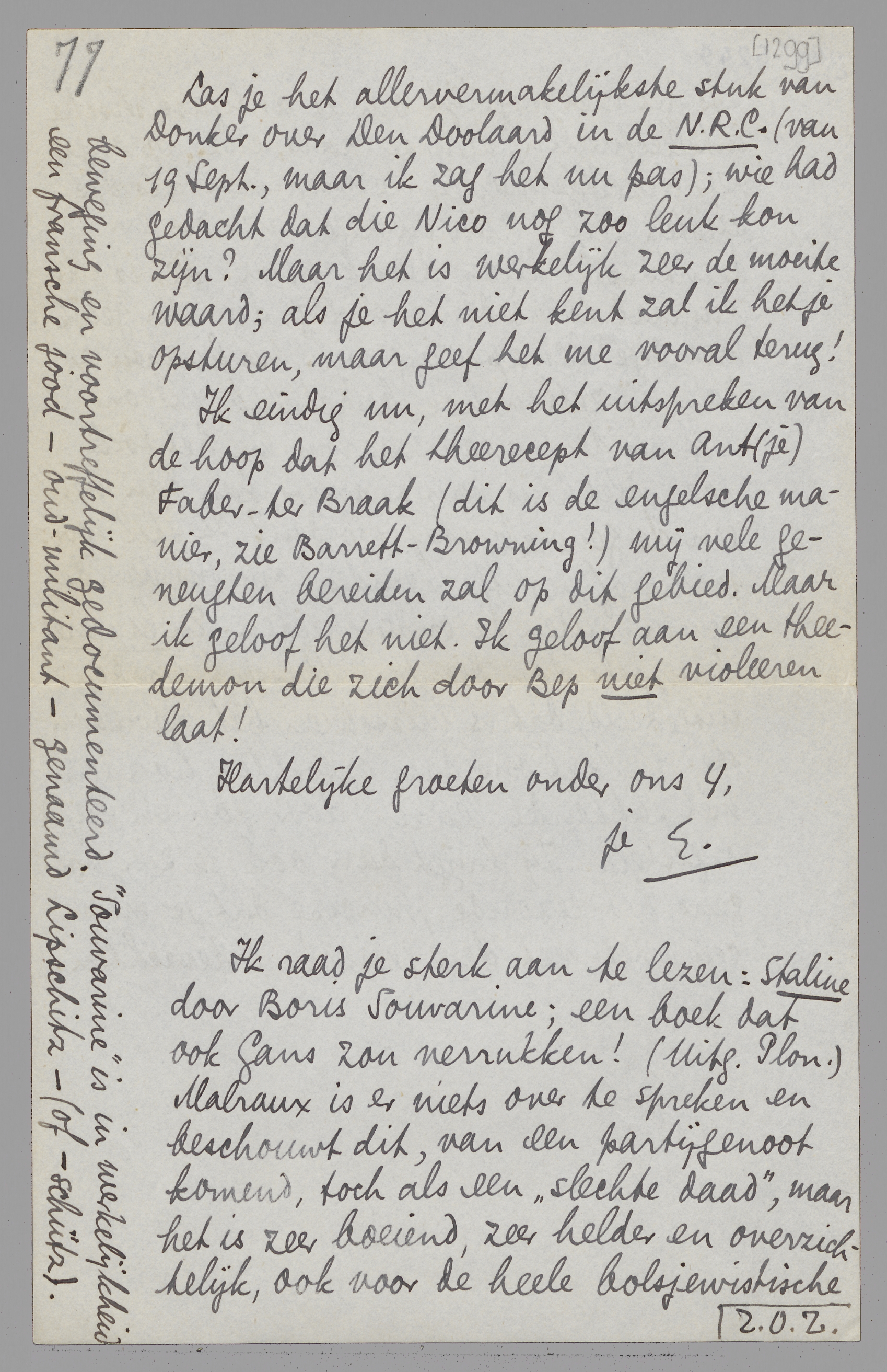 Ik raad je sterk aan te lezen: Staline door Boris Souvarine; een boek dat ook Gans zou verrukken! (Uitg. Plon.) Malraux is er niets over te spreken en beschouwt dit, van een partijgenoot komend, toch als een ‘slechte daad’, maar het is zeer boeiend, zeer helder en overzichtelijk, ook voor de heele bolsjewistische beweging en voortreffelijk gedocumenteerd. ‘Souvarine’ is in werkelijkheid een fransche jood - oud-militant - genaamd Lipschitz - (of -schütz).