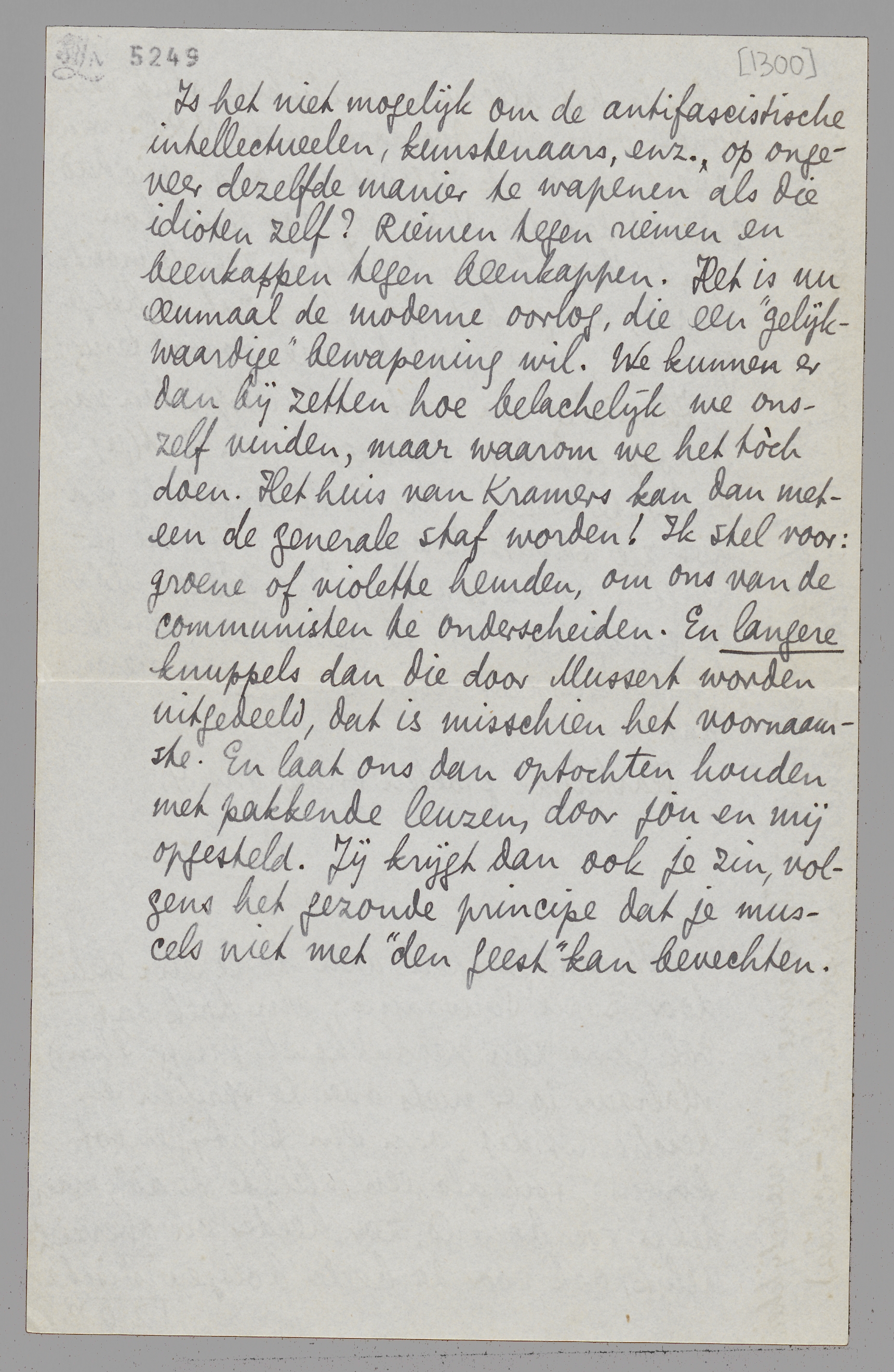 Is het niet mogelijk om de antifascistische intellectueelen, kunstenaars, enz. op ongeveer dezelfde manier te wapenen als die idioten zelf? Riemen tegen riemen en beenkappen tegen beenkappen. Het is nu eenmaal de moderne oorlog, die een ‘gelijkwaardige’ bewapening wil. We kunnen er dan bij zetten hoe belachelijk we onszelf vinden, maar waarom we het tòch doen. Het huis van Kramers kan dan meteen de generale staf worden! Ik stel voor: groene of violette hemden, om ons van de communisten te onderscheiden. En langere knuppels dan die door Mussert worden uitgedeeld, dat is misschien het voornaamste. En laat ons dan optochten houden met pakkende leuzen, door jou en mij opgesteld. Jij krijgt dan ook je zin, volgens het gezonde principe dat je muscels niet met ‘den geest’ kan bevechten.