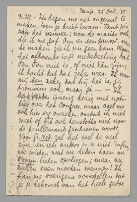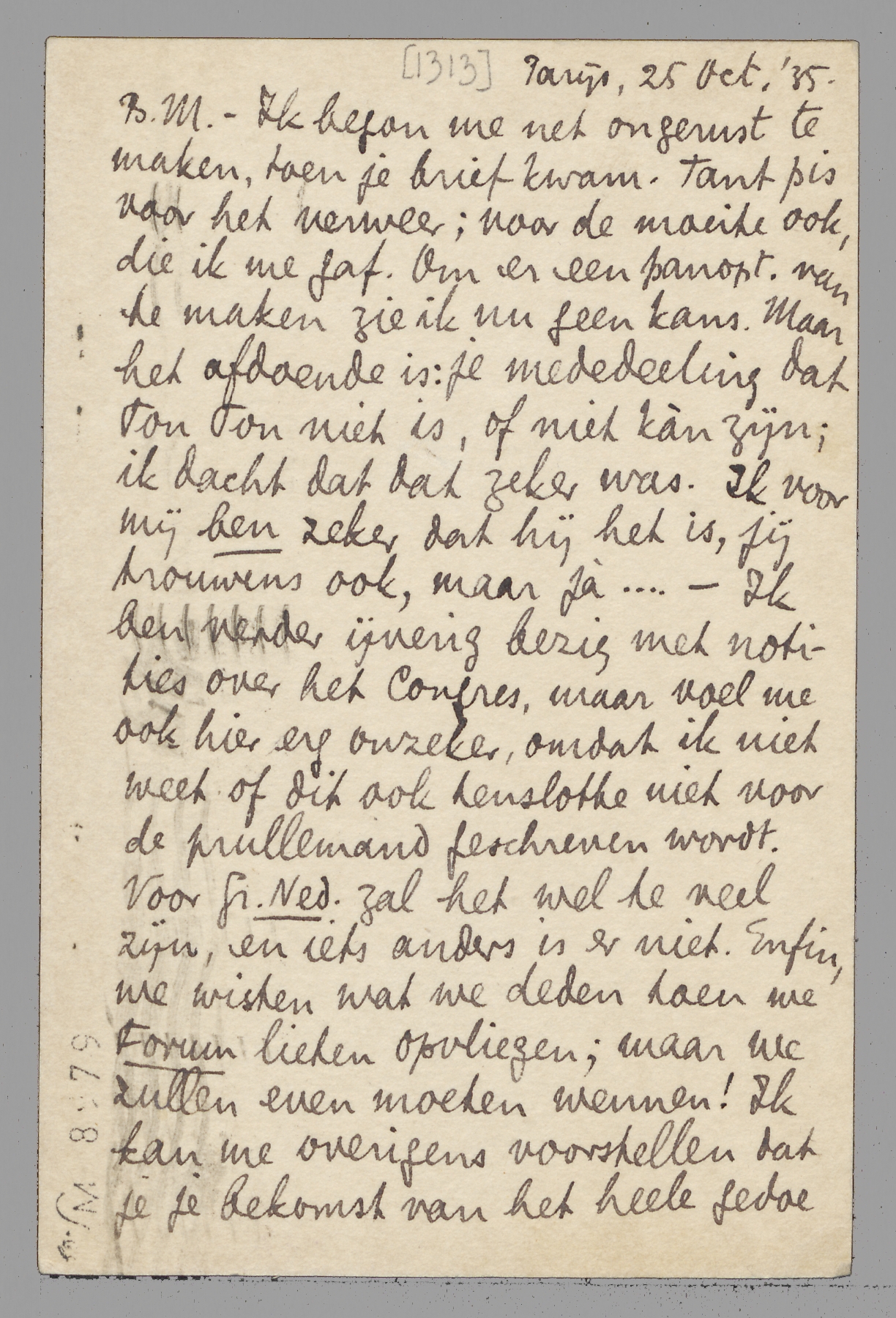 - Ik begon me net ongerust te maken, toen je brief kwam. Tant pis voor het verweer; voor de moeite ook, die ik me gaf. Om er een panopt. van te maken zie ik nu geen kans. Maar het afdoende is: je mededeeling dat Ton Ton niet is, of niet kan zijn; ik dacht dat dat zeker was. Ik voor mij ben zeker dat hij het is, jij trouwens ook, maar ja... - Ik ben verder ijverig bezig met notities over het Congres, maar voel me ook hier erg onzeker, omdat ik niet weet of dit ook tenslotte niet voor de prullemand geschreven wordt. Voor Gr-Ned. zal het wel te veel zijn, en iets anders is er niet. Enfin, we wisten wat we deden toen we Forum lieten opvliegen; maar we zullen even moeten wennen! Ik kan me overigens voorstellen dat je je bekomst van het heele gedoe hebt; Dit is de smeerlapperij geweest van onze ‘politiek’, toen we iets ‘bereiken’ wilden. - -Jan is hier, maar op het oogenblik uit; toch zal ik je ook namens hem veel succes wenschen met de voorstelling! Aan Huizinga ben ik nog niet toe. Later meer dus.