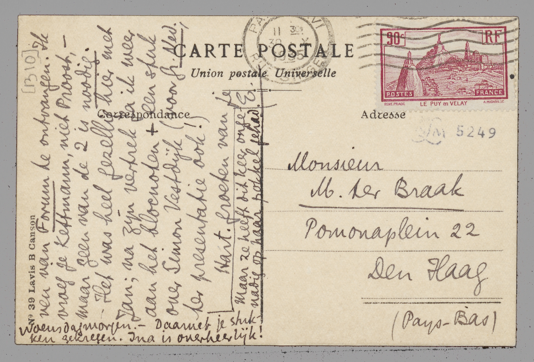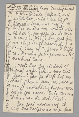 -Querido heeft mij, met veel lullax, verteld dat hij de Blocnotes liever niet uitgaf; de boel is nu dus vrij voor Boucher. Ik heb Q. gevraagd jou de copy te sturen. Wil je zoo goed zijn die, als je langs Noordeinde 39a komt, even af te geven? liefst aan Boucher Jr. in persoon. Bij voorbaat dank.