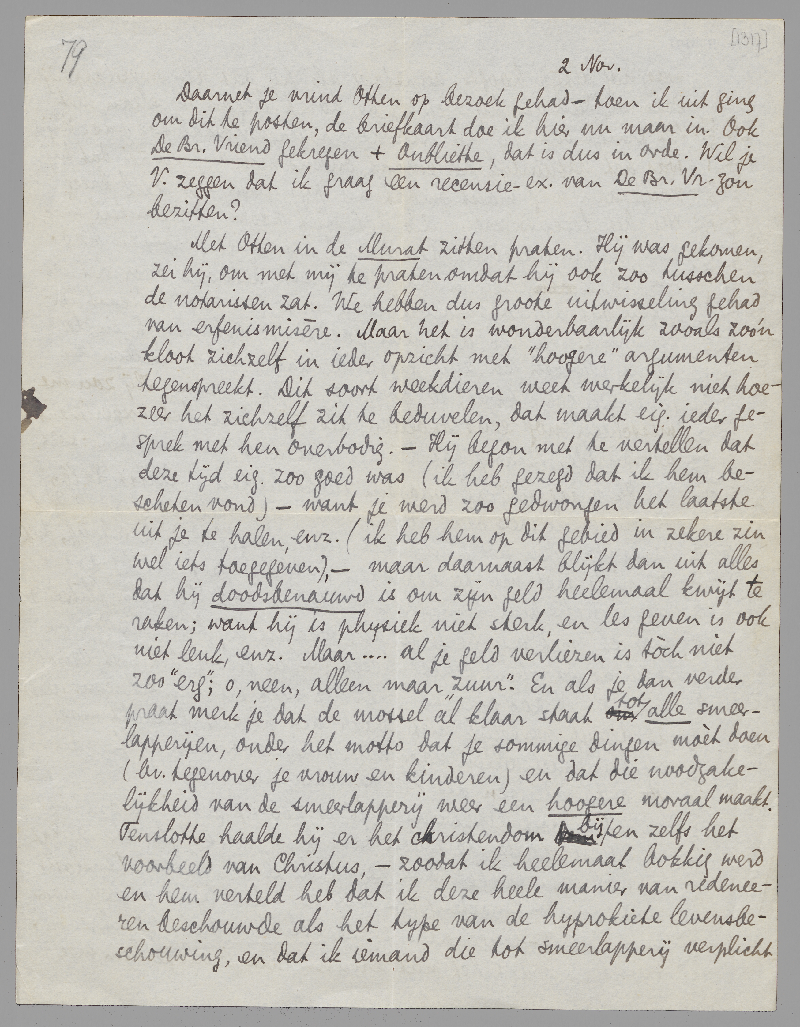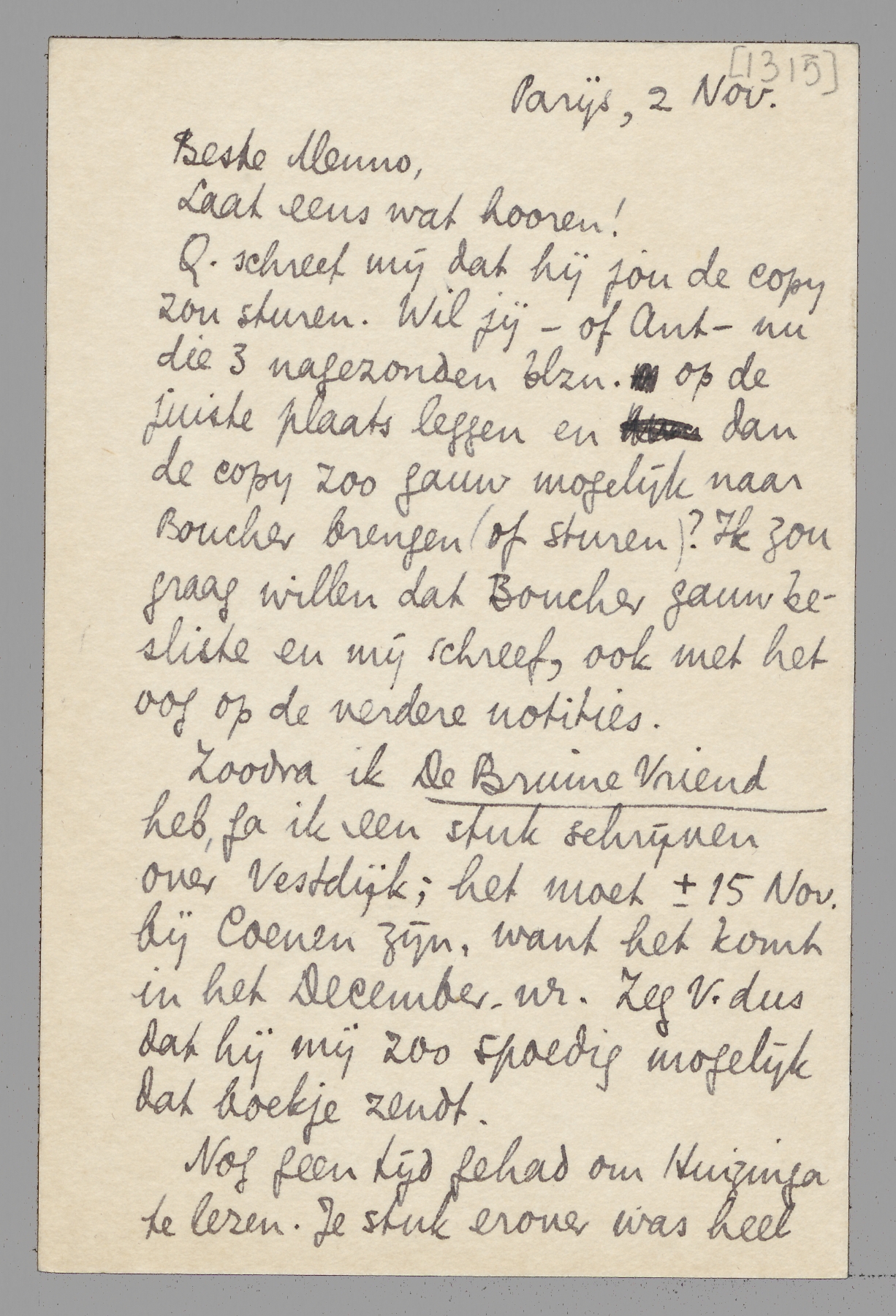 Zoodra ik De Bruine Vriend heb, ga ik een stuk schrijven over Vestdijk; het moet ± 15 Nov. bij Coenen zijn, want het komt in het December-nr. Zeg V. dus dat hij mij zoo spoedig mogelijk dat boekje zendt.