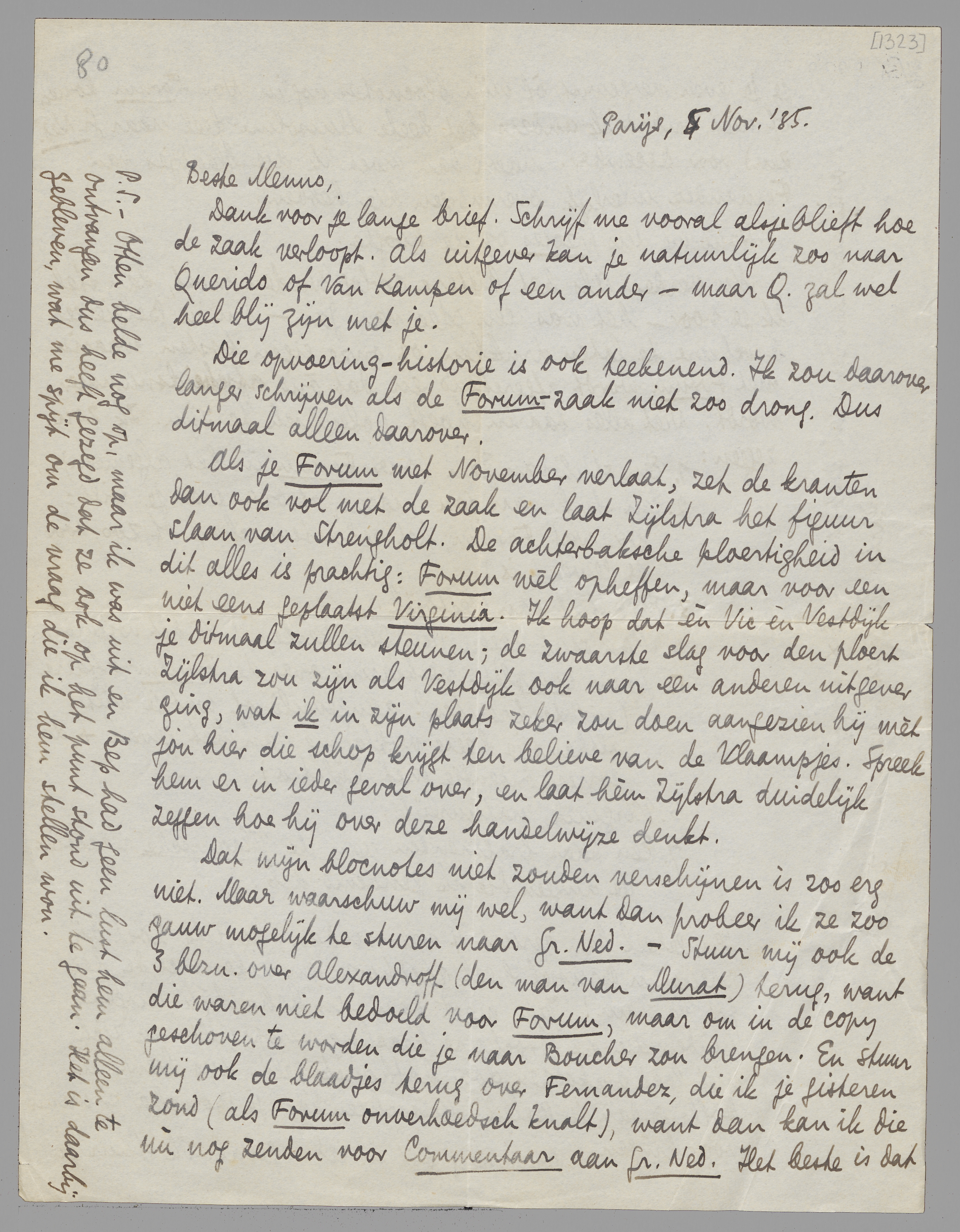 Dat mijn blocnotes niet zouden verschijnen is zoo erg niet. Maar waarschuw mij wel, want dan probeer ik ze zoo gauw mogelijk te sturen naar Gr. Ned. - Stuur mij ook de 3 blzn. over Alexandroff (den man van Murat) terug, want die waren niet bedoeld voor Forum, maar om in de copy geschoven te worden die je naar Boucher zou brengen. En stuur mij ook de blaadjes terug over Fernandez, die ik je gisteren zond (als Forum onverhoedsch knalt), want dan kan ik die nú nog zenden voor Commentaar aan Gr. Ned. Het beste is dat je je even vergewist of mijn blocnotes nog in Nov.-Forum komen of niet, omdat ik anders het heele Mussolini-deel naar Gr. Ned. zend voor December. Maar dan moet ik die blaadjes van Fernandez uiterlijk overmorgen hier hebben.