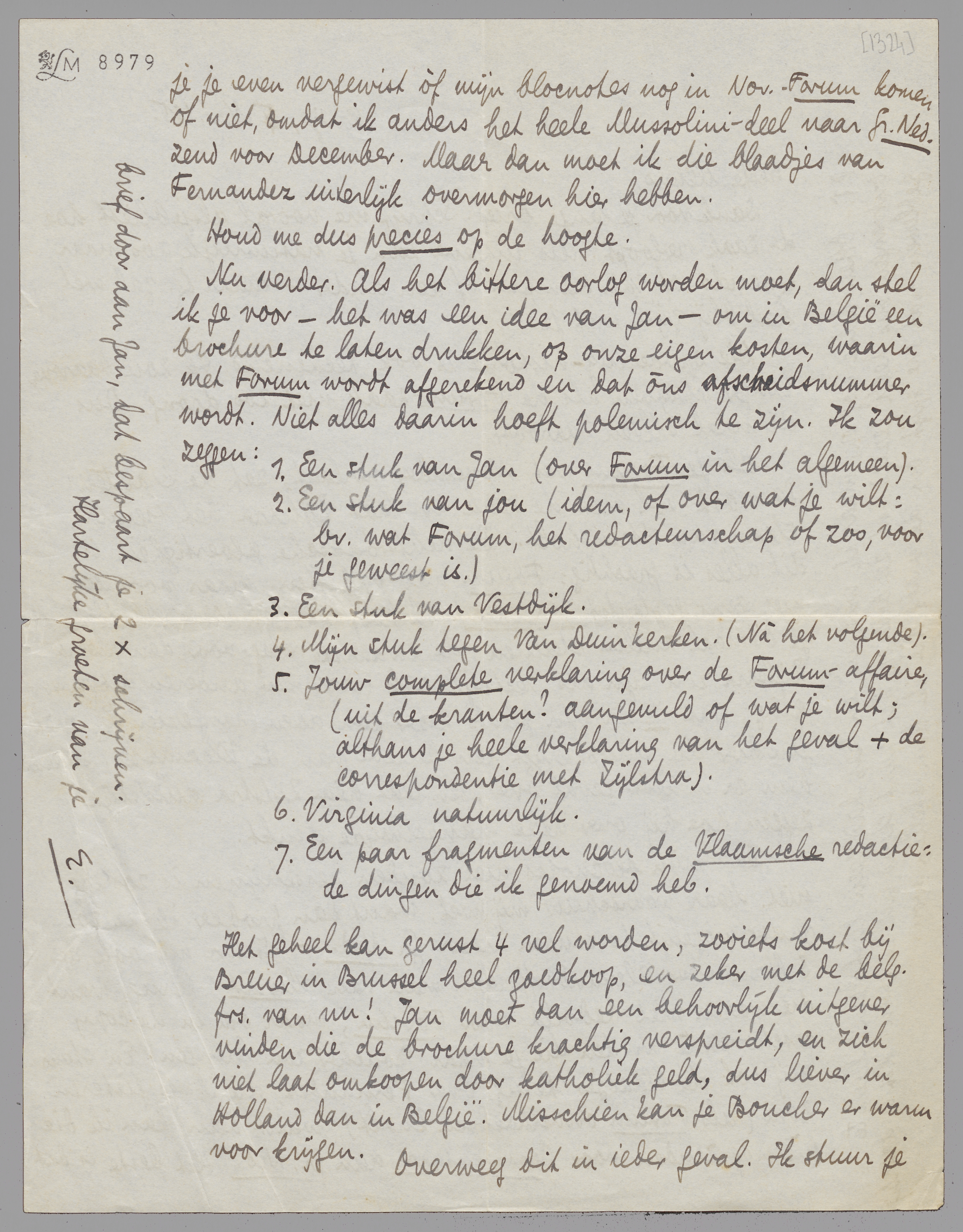 Nu verder. Als het bittere oorlog worden moet, dan stel ik je voor - het was een idee van Jan - om in België een brochure te laten drukken, op onze eigen kosten, waarin met Forum wordt afgerekend en dat ons afscheidsnummer wordt. Niet alles daarin hoeft polemisch te zijn. Ik zou zeggen:
