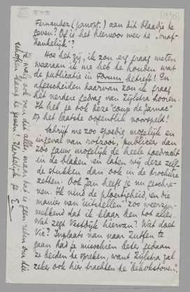 Dank voor het 1e nr. van De Sleutel, dat jij mij zeker hebt laten toezenden? Geef me als lid op. Zoodra ik uit Bretagne terug ben, zal ik mij ervoor spannen om Vigilance en dit samen te brengen. Maar zeg jij dien studenten, aangezien jij het contact met hen hèbt, dat ze zich aansluiten (samensmelten) met die 300 antifascistische kunstenaars van Rotterdam, met de groep van Rümke-Kramers, met alles wat maar antifascist is. We moeten het nu eenmaal van de massa hebben. Zelfs als ze gescheiden willen blijven in hun organisaties, zou er een soort centraal-comité gevormd moeten worden.