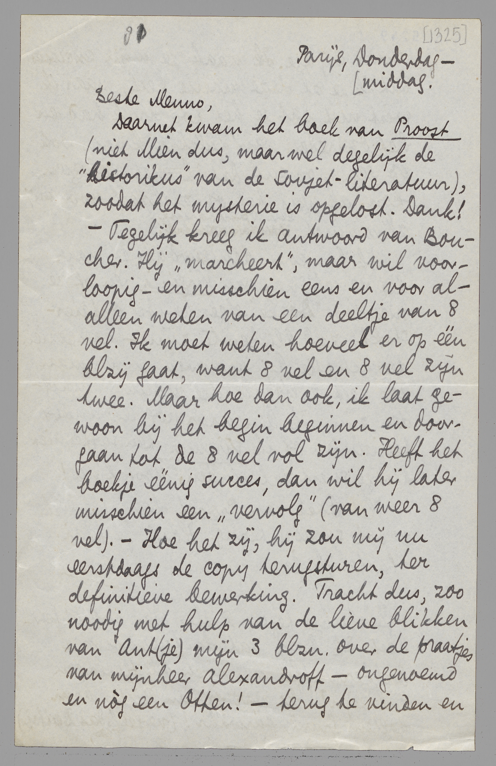 Daarnet kwam het boek van Proost (niet Mien dus, maar wel degelijk de ‘historikus’ van de Sovjet-literatuur), zoodat het mysterie is opgelost. Dank! - Tegelijk kreeg ik antwoord van Boucher. Hij ‘marcheert’, maar wil voorloopig - en misschien eens en voor al - alleen weten van een deeltje van 8 vel. Ik moet weten hoeveel er op één blzij. gaat, want 8 vel en 8 vel zijn twee. Maar hoe dan ook, ik laat gewoon bij het begin beginnen en doorgaan tot de 8 vel vol zijn. Heeft het boekje éénig succes, dan wil hij later misschien een ‘vervolg’ (van weer 8 vel). - Hoe het zij, hij zou mij nu eerstdaags de copy terugsturen, ter definitieve bewerking. Tracht dus, zoo noodig met hulp van de lieve blikken van Ant(je) mijn 3 blzn. over de praatjes van mijnheer Alexandroff - ongenoemd en nòg een Otten! - terug te vinden en stuur mij die. Ik maak je mijn excuses dat ik je al deze moeite geef, maar ik wist niet dat je het zóó druk had en het optreden van Zijlstra kwam ook op een moment dat ik niet voorzien kón, al was het op zichzelf voor mij allerminst een openbaring.