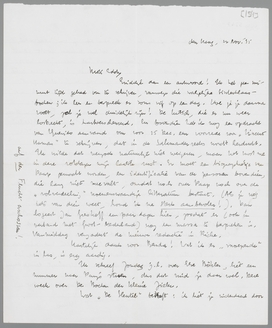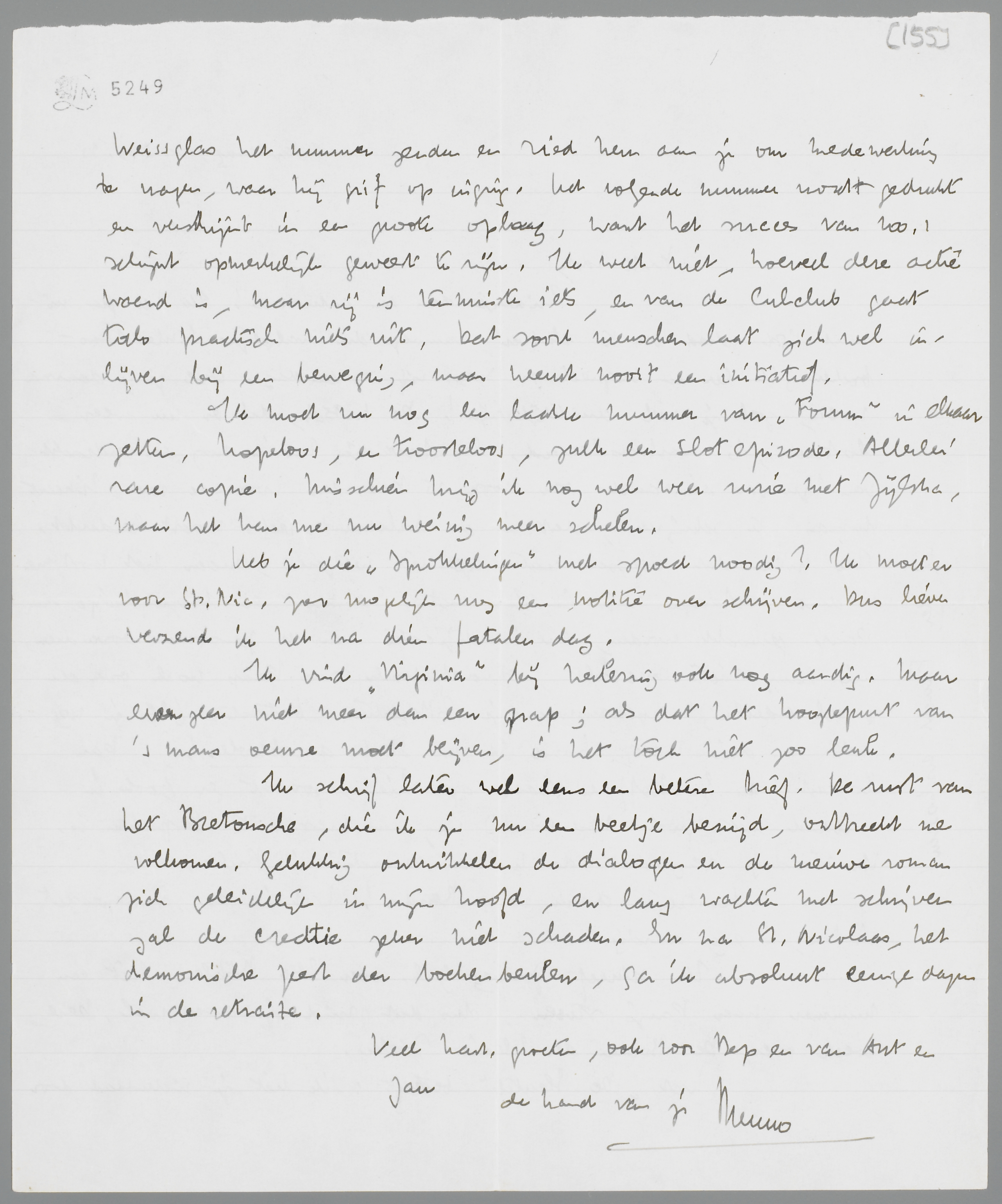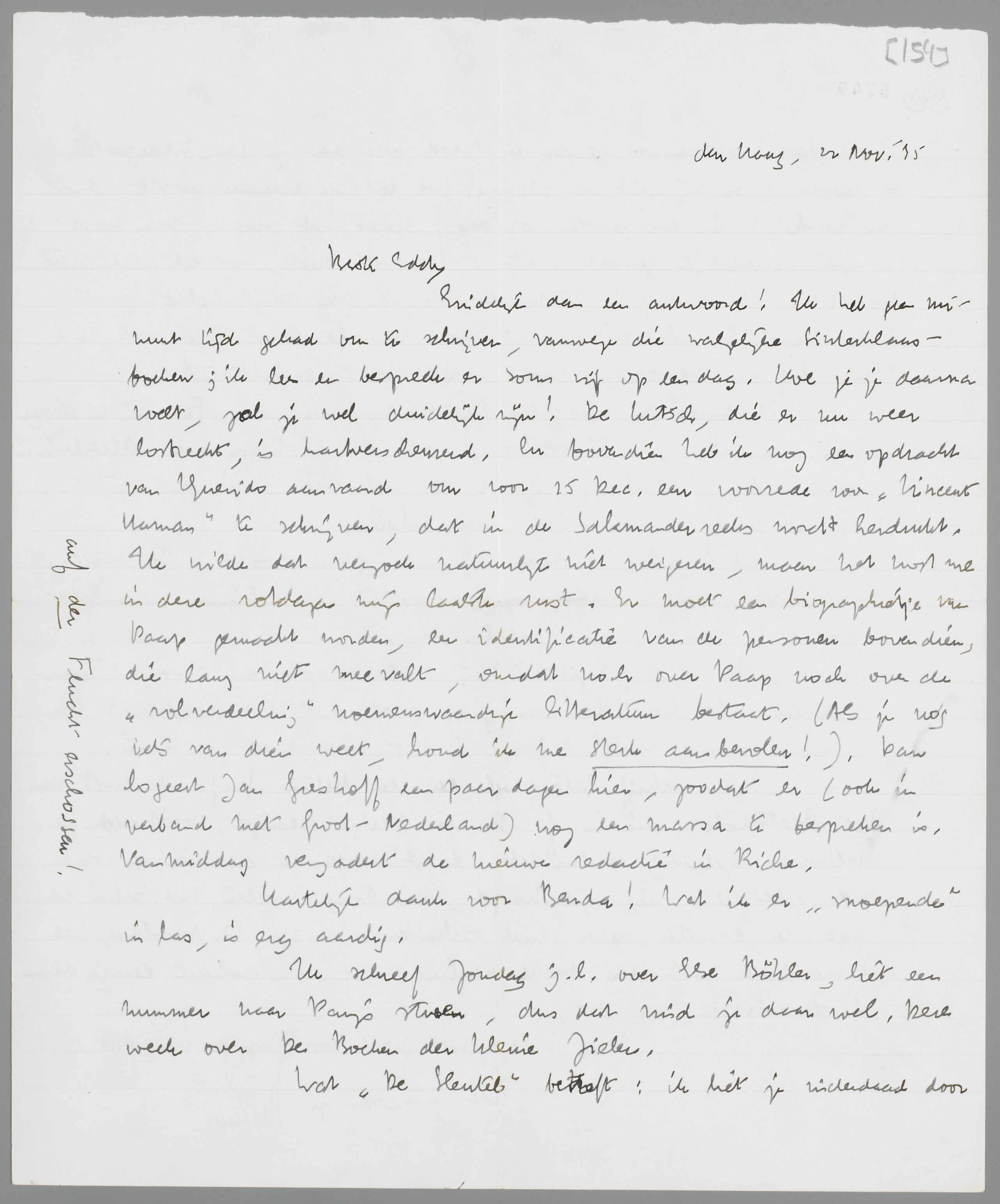 Eindelijk dan een antwoord! Ik heb geen minuut tijd gehad om te schrijven, vanwege die walgelijke Sinterklaasboeken; ik lees en bespreek er soms vijf op een dag. Hoe je je daarna voelt, zal je wel duidelijk zijn! De kitsch, die er nu weer losbreekt, is hartverscheurend. En bovendien heb ik nog een opdracht van Querido aanvaard om voor 15 Dec. een voorrede voor Vincent Haman te schrijven, dat in de Salamanderreeks wordt herdrukt. Ik wilde dat verzoek natuurlijk niet weigeren, maar het kost me in deze rotdagen mijn laatste rust. Er moet een biographietje van Paap gemaakt worden, een identificatie van de personen bovendien, die lang niet meevalt, omdat noch over Paap noch over de ‘rolverdeeling’ noemenswaardige litteratuur bestaat. (Als je nog iets van dien weet, houd ik me sterk aanbevolen!). Dan logeert Jan Greshoff een paar dagen hier, zoodat er (ook in verband met Groot-Nederland) nog een massa te bespreken is. Vanmiddag vergadert de nieuwe redactie in Riche.