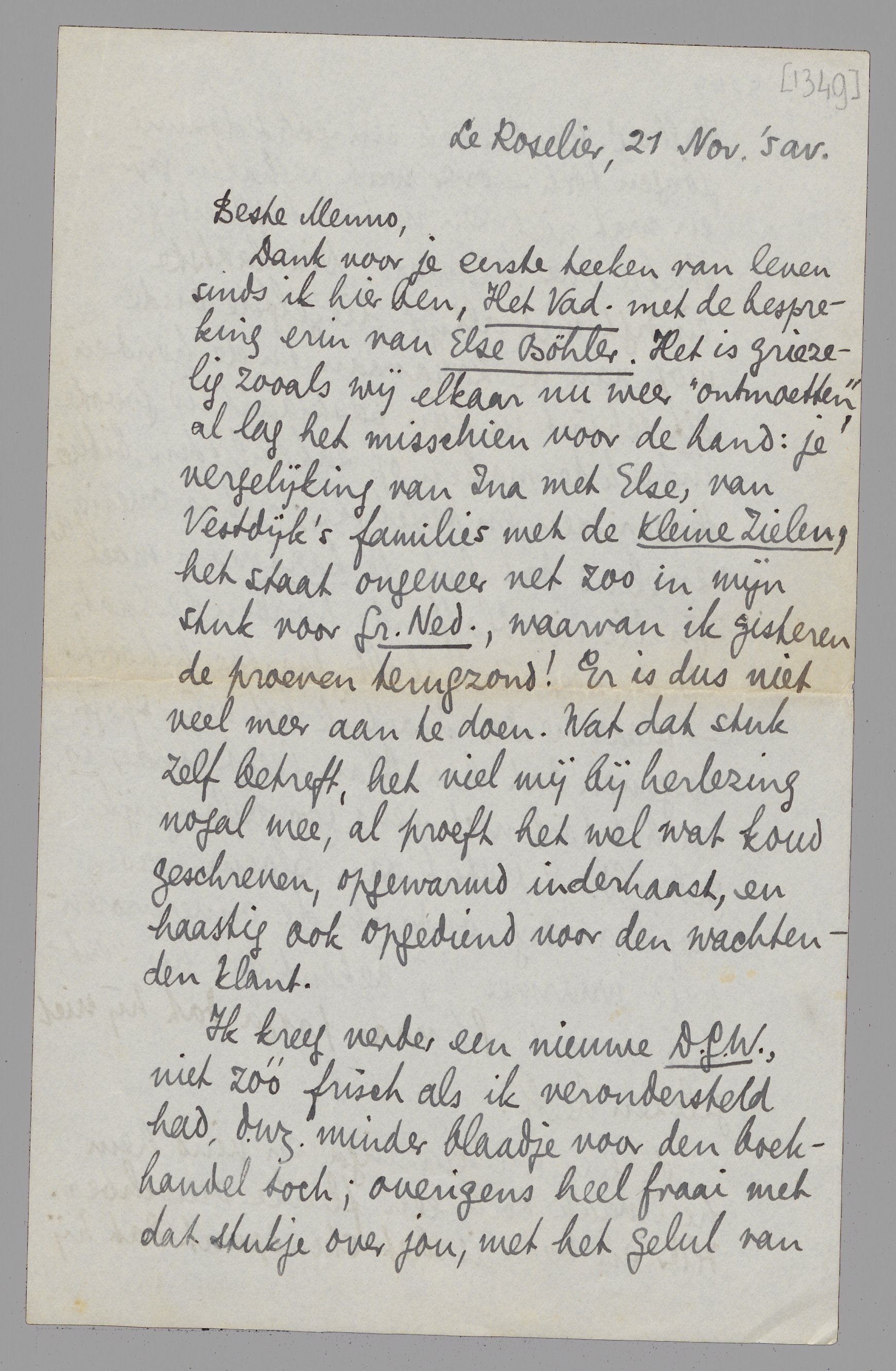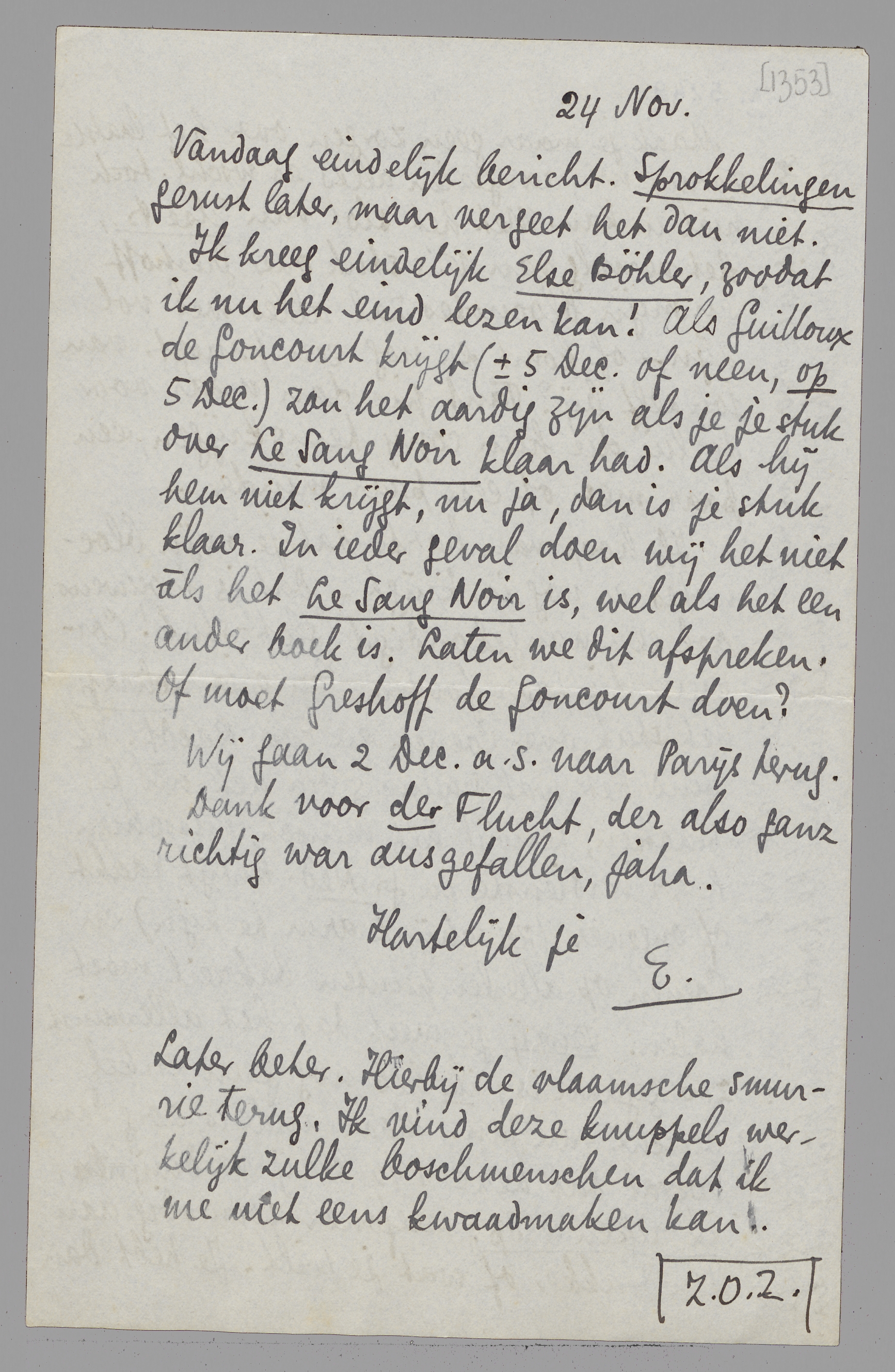 Ik kreeg eindelijk Else Böhler zoodat ik nu het eind lezen kan! Als Guilloux de Goncourt krijgt (± 5 Dec. of neen, op 5 Dec.) zou het aardig zijn als je je stuk over Le Sang Noir klaar had. Als hij hem niet krijgt, nu ja, dan is je stuk klaar. In ieder geval doen wij het niet àls het Le Sang Noir is, wel als het een ander boek is. Laten we dit afspreken. Of moet Greshoff de Goncourt doen?
