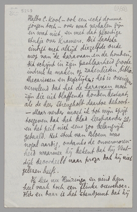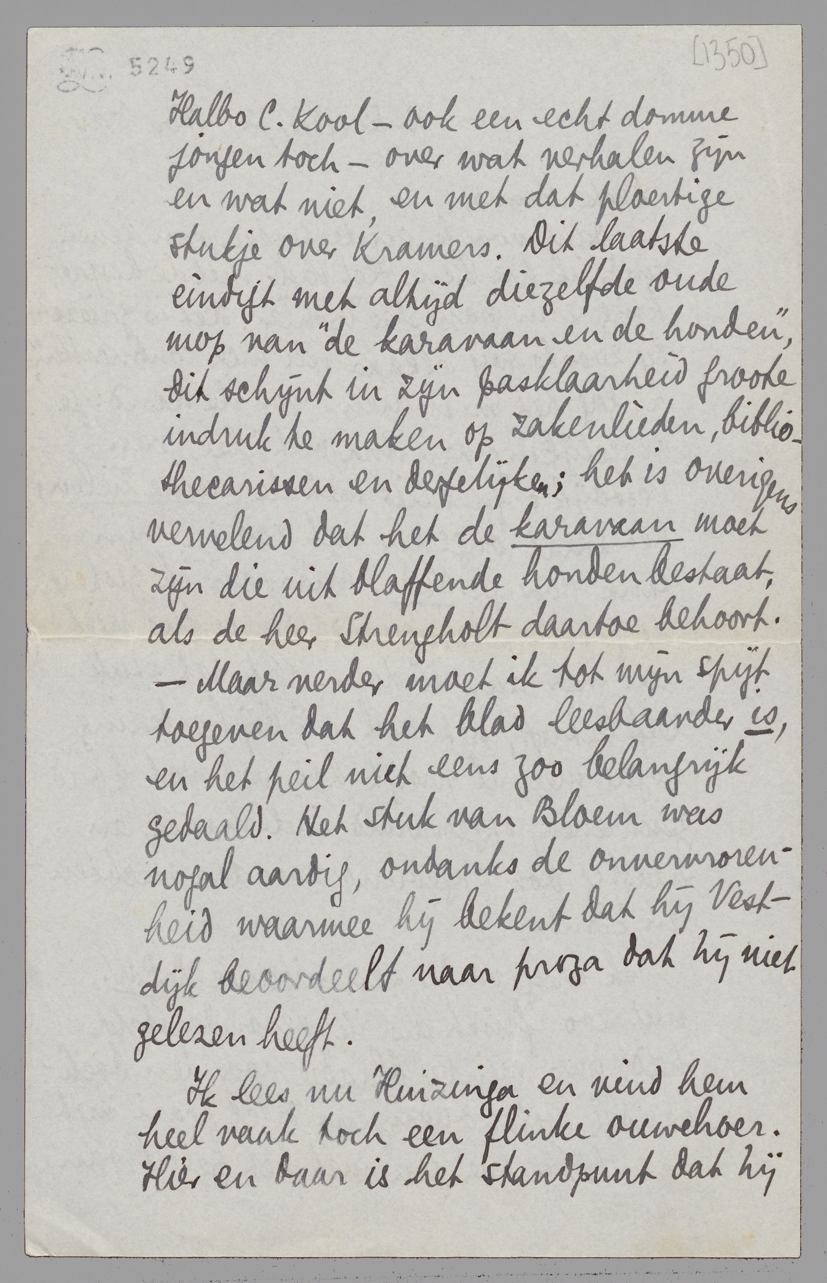 Ik kreeg verder een nieuwe D.G.W., niet zóó frisch als ik verondersteld had, d.w.z. minder blaadje voor den boekhandel toch; overigens heel fraai met dat stukje over jou, met het gelul van Halbo C. Kool - ook een echt domme jongen toch - over wat verhalen zijn en wat niet, en met dat ploertige stukje over Kramers. Dit laatste eindigt met altijd diezelfde oude mop van ‘de karavaan en de honden’, dit schijnt in zijn pasklaarheid groote indruk te maken op zakenlieden, bibliothecarissen en dergelijken; het is overigens vervelend dat het de karavaan moet zijn die uit blaffende honden bestaat, als de heer Strengholt daartoe behoort. - Maar verder moet ik tot mijn spijt toegeven dat het blad leesbaarder is, en het peil niet eens zoo belangrijk gedaald. Het stuk van Bloem was nogal aardig, ondanks de onvervrorenheid waarmee hij bekent dat hij Vestdijk beoordeelt naar proza dat hij niet gelezen heeft.