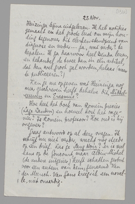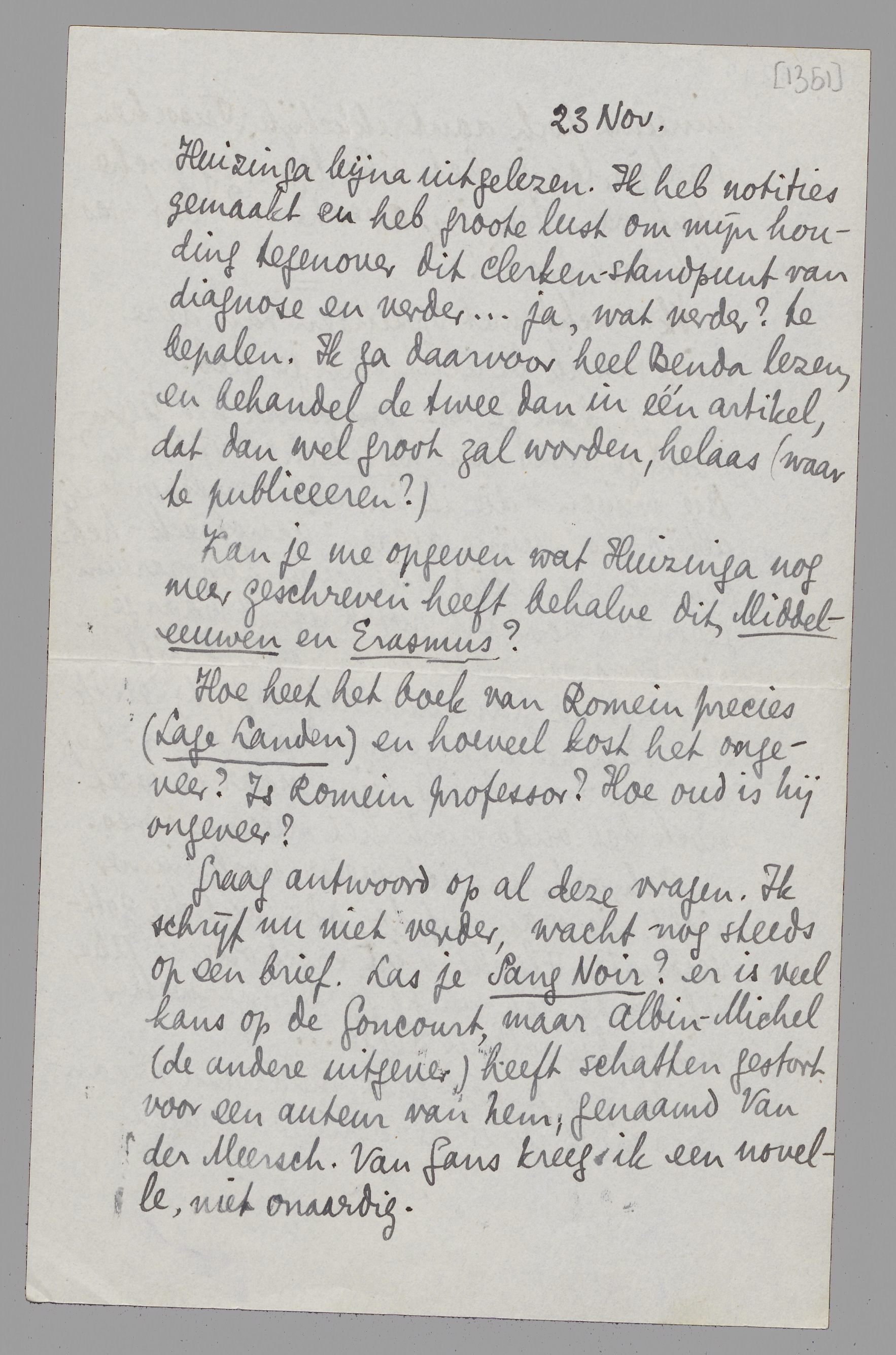 Huizinga bijna uitgelezen. Ik heb notities gemaakt en heb groote lust om mijn houding tegenover dit clerken-standpunt van diagnose en verder... ja, wat verder? te bepalen. Ik ga daarvoor heel Benda lezen, en behandel de twee dan in één artikel, dat dan wel groot zal worden, helaas (waar te publiceeren?)