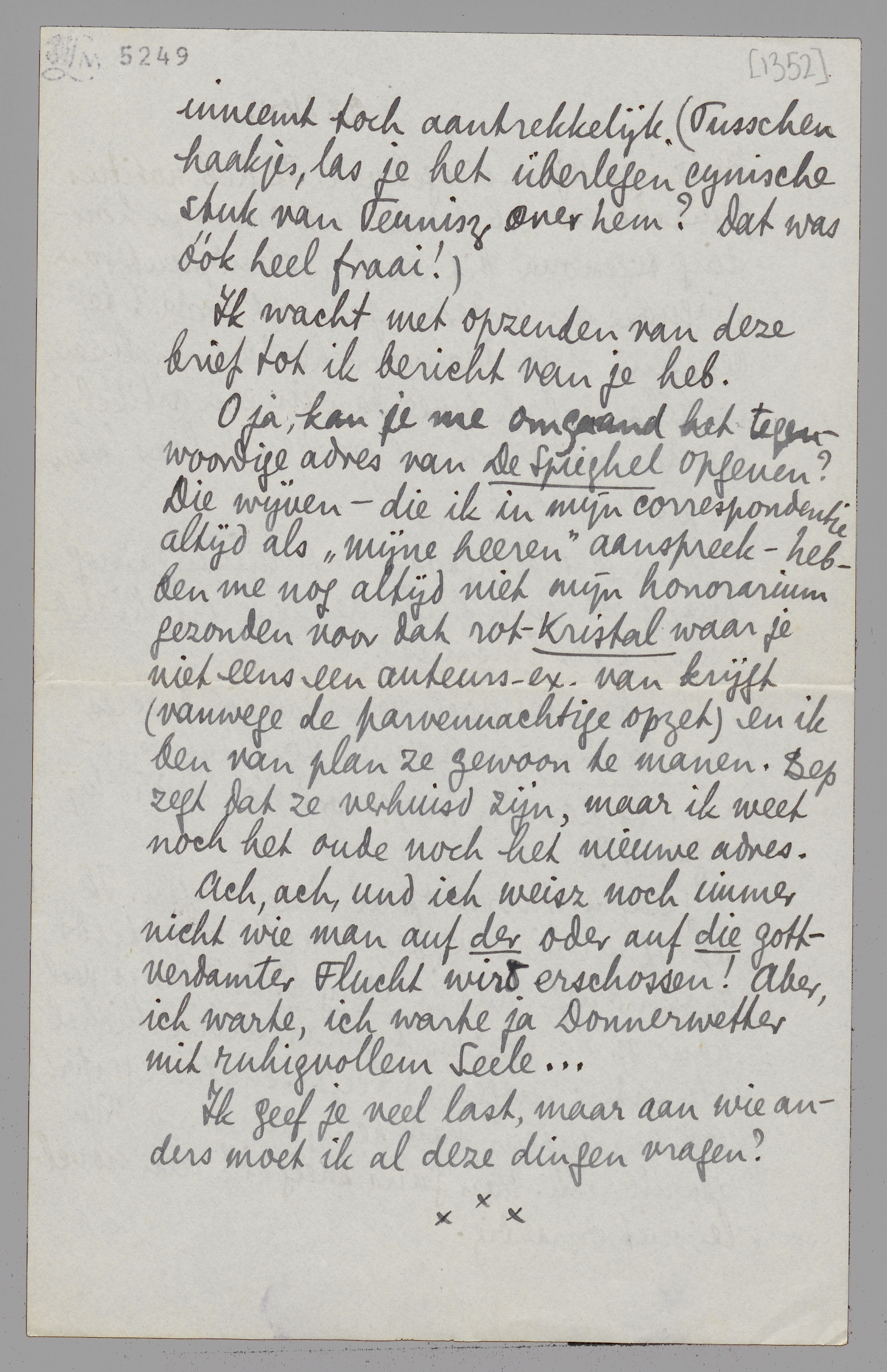 O ja, kan je me omgaand het tegenwoordige adres van De Spieghel opgeven? Die wijven - die ik in mijn correspondentie altijd als ‘mijne heeren’ aanspreek - hebben me nog altijd niet mijn honorarium gezonden voor dat rot-Kristal waar je niet eens een auteurs-ex- van krijgt, (vanwege de parvenuachtige opzet) en ik ben van plan ze gewoon te manen. Bep zegt dat ze verhuisd zijn, maar ik weet nog het oude noch het nieuwe adres.