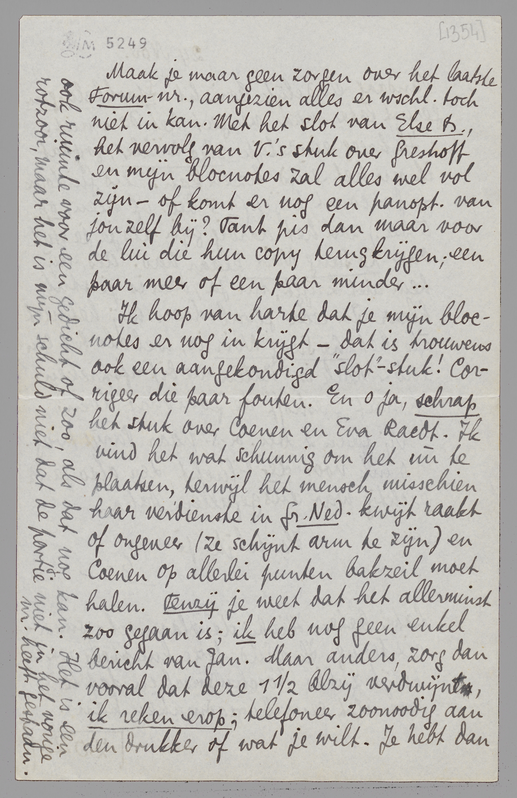 Ik hoop van harte dat je mijn blocnotes er nog in krijgt - dat is trouwens ook een aangekondigd ‘slot’-stuk! Corrigeer die paar fouten. En o ja, schrap het stuk over Coenen en Eva Raedt. Ik vind het wat schunnig om het nù te plaatsen, terwijl het mensch misschien haar verdienste in Gr. Ned. kwijt raakt of ongeveer (ze schijnt arm te zijn) en Coenen op allerlei punten bakzeil moet halen. Tenzij je weet dat het allerminst zoo gegaan is; ik heb nog geen enkel bericht van Jan. Maar anders, zorg dan vooral dat deze 1½ blzij. verdwijnt, ik reken erop; telefoneer zoonoodig aan den drukker of wat je wilt. Je hebt dan ook ruimte voor een gedicht of zoo, als dat nog kan. Het is een rotzooi, maar het is mijn schuld niet dat de portie niet in het vorige nr. heeft gestaan.