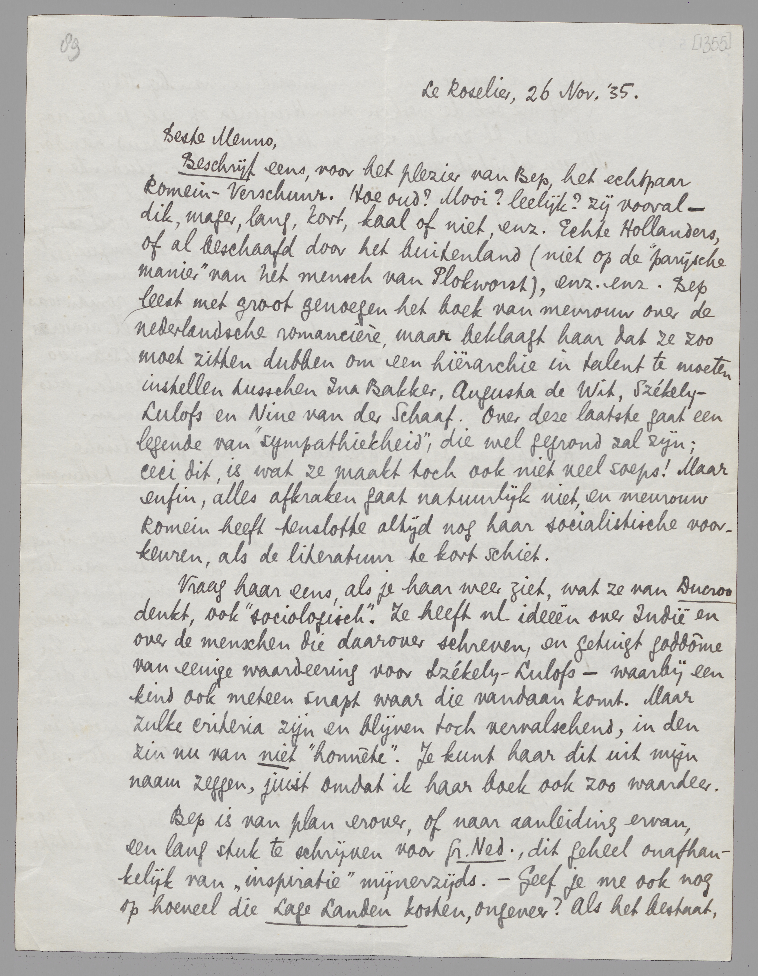 Beschrijf eens, voor het plezier van Bep, het echtpaar Romein-Verschuur. Hoe oud? Mooi? leelijk? zij vooral - dik, mager, lang, kort, kaal of niet, enz. Echte Hollanders, of al beschaafd door het buitenland (niet op de ‘parijsche manier’ van het mensch van Plokworst), enz. enz. Bep leest met groot genoegen het boek van mevrouw over de nederlandsche romancière, maar beklaagt haar dat ze zoo moet zitten dubben om een hiërarchie in talent te moeten instellen tusschen Ina Bakker, Augusta de Wit, Székely-Lulofs en Nine van der Schaaf. Over deze laatste gaat een legende van ‘sympathiekheid’, die wel gegrond zal zijn; ceci dit, is wat ze maakt toch ook niet veel soeps! Maar enfin, alles afkraken gaat natuurlijk niet, en mevrouw Romein heeft tenslotte altijd nog haar socialistische voorkeuren, als de literatuur te kort schiet.