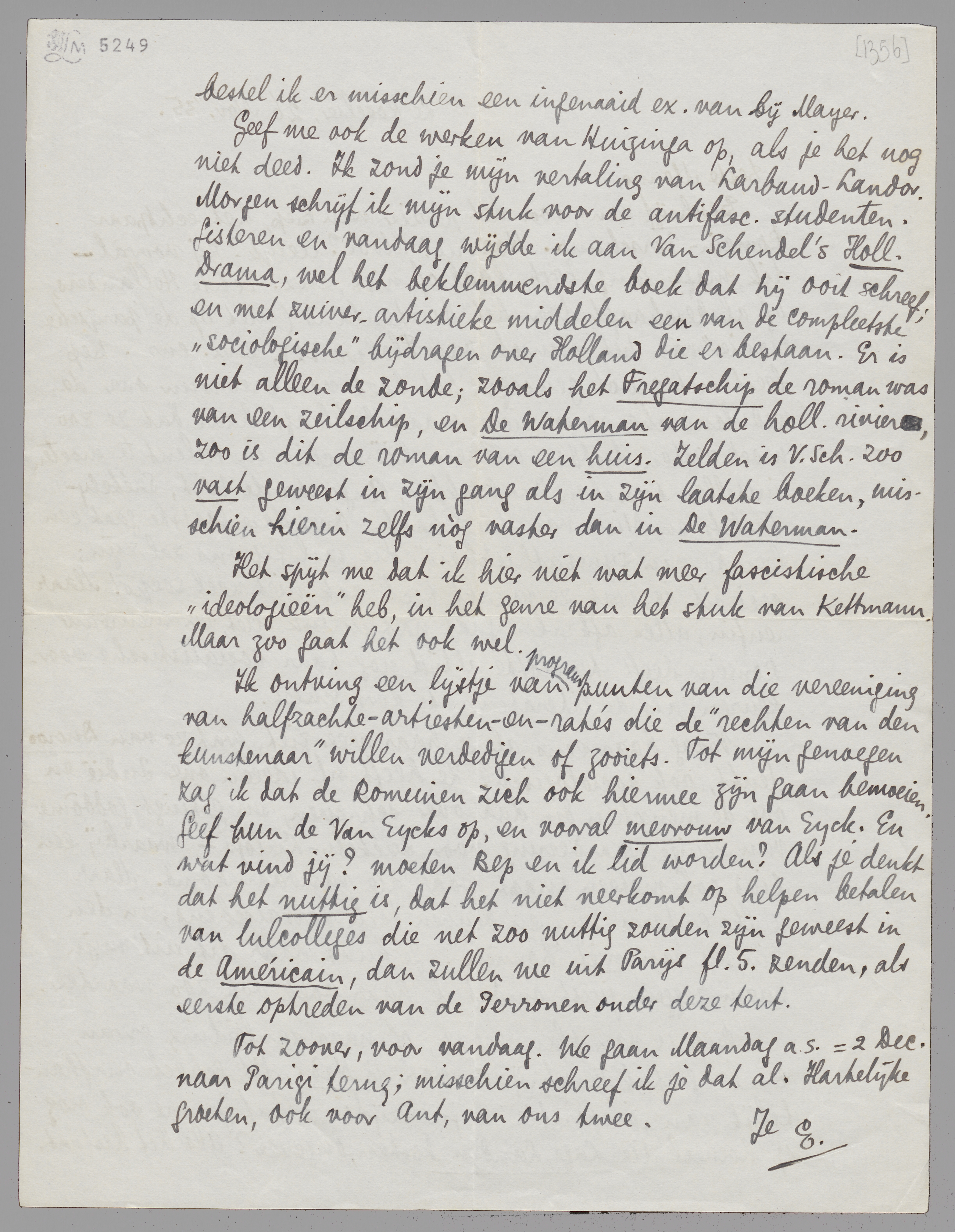 Geef me ook de werken van Huizinga op, als je het nog niet deed. Ik zond je mijn vertaling van Larbaud-Landor. Morgen schrijf ik mijn stuk voor de antifasc. studenten. Gisteren en vandaag wijdde ik aan Van Schendel's Holl. Drama, wel het beklemmendste boek dat hij ooit schreef, en met zuiver-artistieke middelen een van de compleetste ‘sociologische’ bijdragen over Holland die er bestaan. Er is niet alleen de zonde; zooals het Fregatschip de roman was van een zeilschip, en De Waterman van de holl. rivier, zoo is dit de roman van een huis. Zelden is V. Sch. zoo vast geweest in zijn gang als in zijn laatste boeken, misschien hierin zelfs nòg vaster dan in De Waterman.
