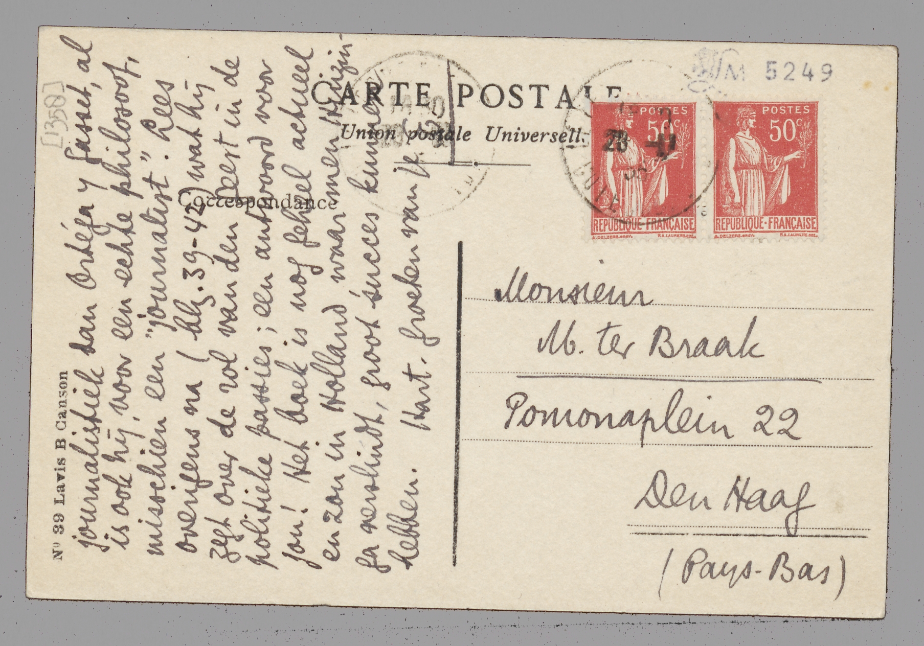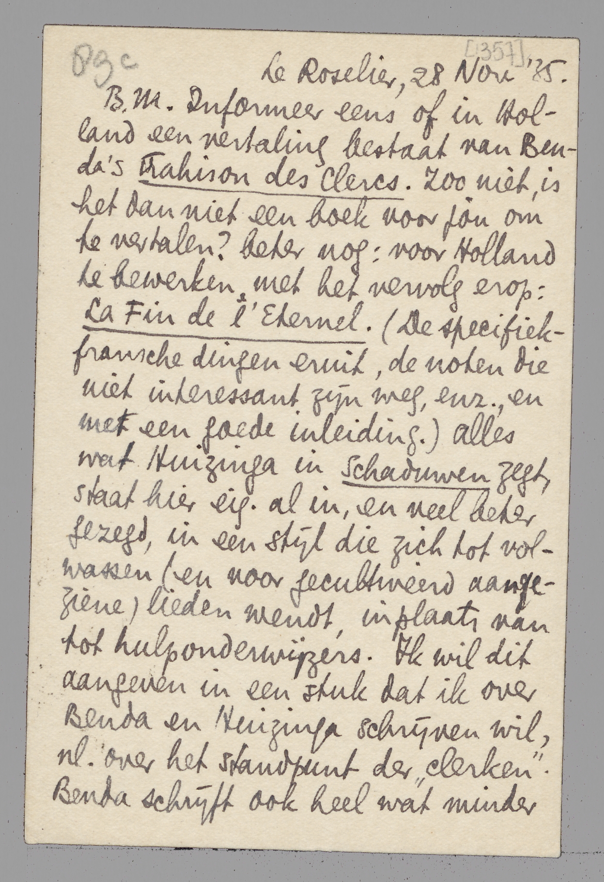 Informeer eens of in Holland een vertaling bestaat van Benda's Trahison des Clercs. Zoo niet, is het dan niet een boek voor jou om te vertalen? beter nog: voor Holland te bewerken, met het vervolg erop: La Fin de l'Eternel. (De specifiek-fransche dingen eruit, de noten die niet interessant zijn weg, enz. en met een goede inleiding.) Alles wat Huizinga in Schaduwen zegt, staat hier eig. al in, en veel beter gezegd, in een stijl die zich tot volwassen (en voor gecultiveerd aangeziene) lieden wendt, inplaats van tot hulponderwijzers. Ik wil dit aangeven in een stuk dat ik over Benda en Huizinga schrijven wil, nl. over het standpunt der ‘clerken’. Benda schrijft ook heel wat minder journalistiek dan Ortéga y Gasset, al is ook hij voor een echte philosoof misschien een ‘journalist’. Lees overigens na (blz. 39-42) wat hij zegt over de rol van den geest in de politieke passies; een antwoord voor jou! Het boek is nog geheel actueel en zou in Holland, waar men Huizinga verslindt, groot succes kunnen hebben.