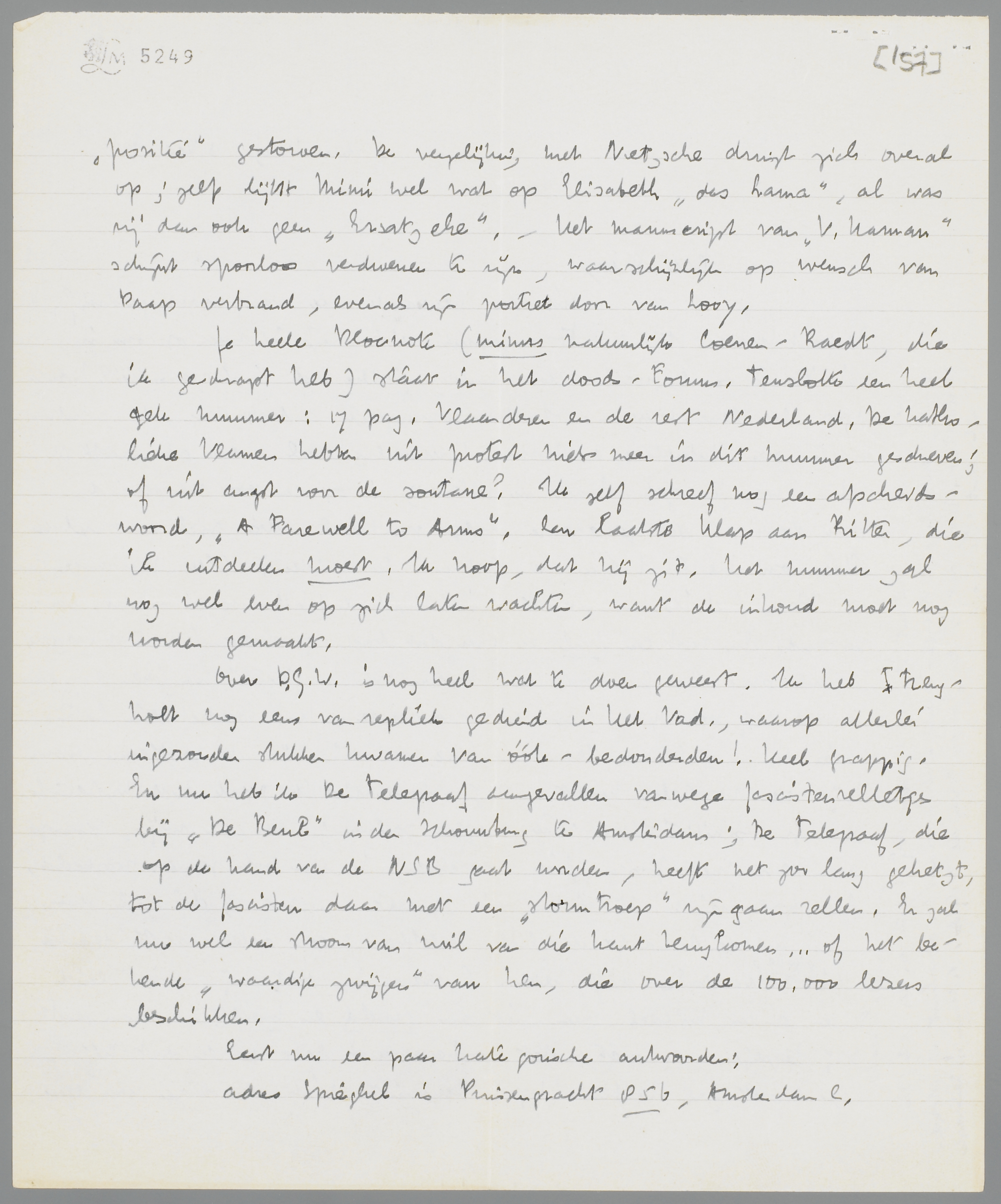 Over D.G.W. is nog heel wat te doen geweest. Ik heb Strengholt nog eens van repliek gediend in Het Vad., waarop allerlei ingezonden stukken kwamen van óók-bedonderden! Heel grappig. En nu heb ik De Telegraaf aangevallen vanwege fascistenrelletjes bij De Beul in den schouwburg te Amsterdam; De Telegraaf, die op de hand van de N.S.B. gaat worden, heeft net zoo lang gehetzt, tot de fascisten daar met een ‘stormtroep’ zijn gaan rellen. Er zal nu wel een stroom van vuil van die kant terugkomen... of het bekende ‘waardige zwijgen’ van hen, die over de 100.000 lezers beschikken.