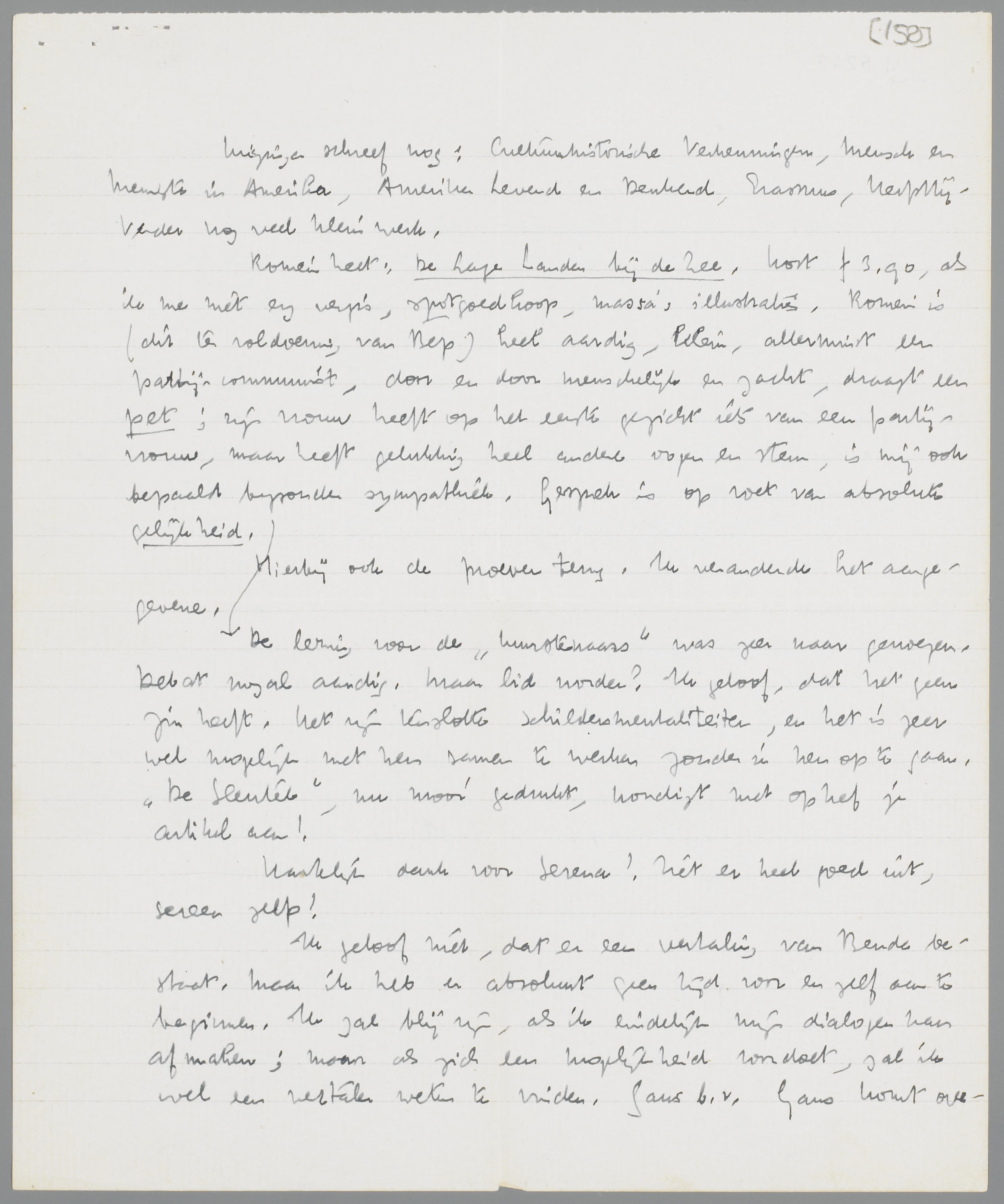 Romein heet: De Lage Landen bij de Zee. Kost f 3,90, als ik me niet erg vergis, spotgoedkoop, massa's illustraties. Romein is (dit ter voldoening van Bep) heel aardig, klein, allerminst een partij-communist, door en door menschelijk en zacht, draagt een pet; zijn vrouw heeft op het eerste gezicht iets van een partijvrouw, maar heeft gelukkig heel andere oogen en stem, is mij ook bepaald bijzonder sympathiek. Gesprek is op voet van absolute gelijkheid.