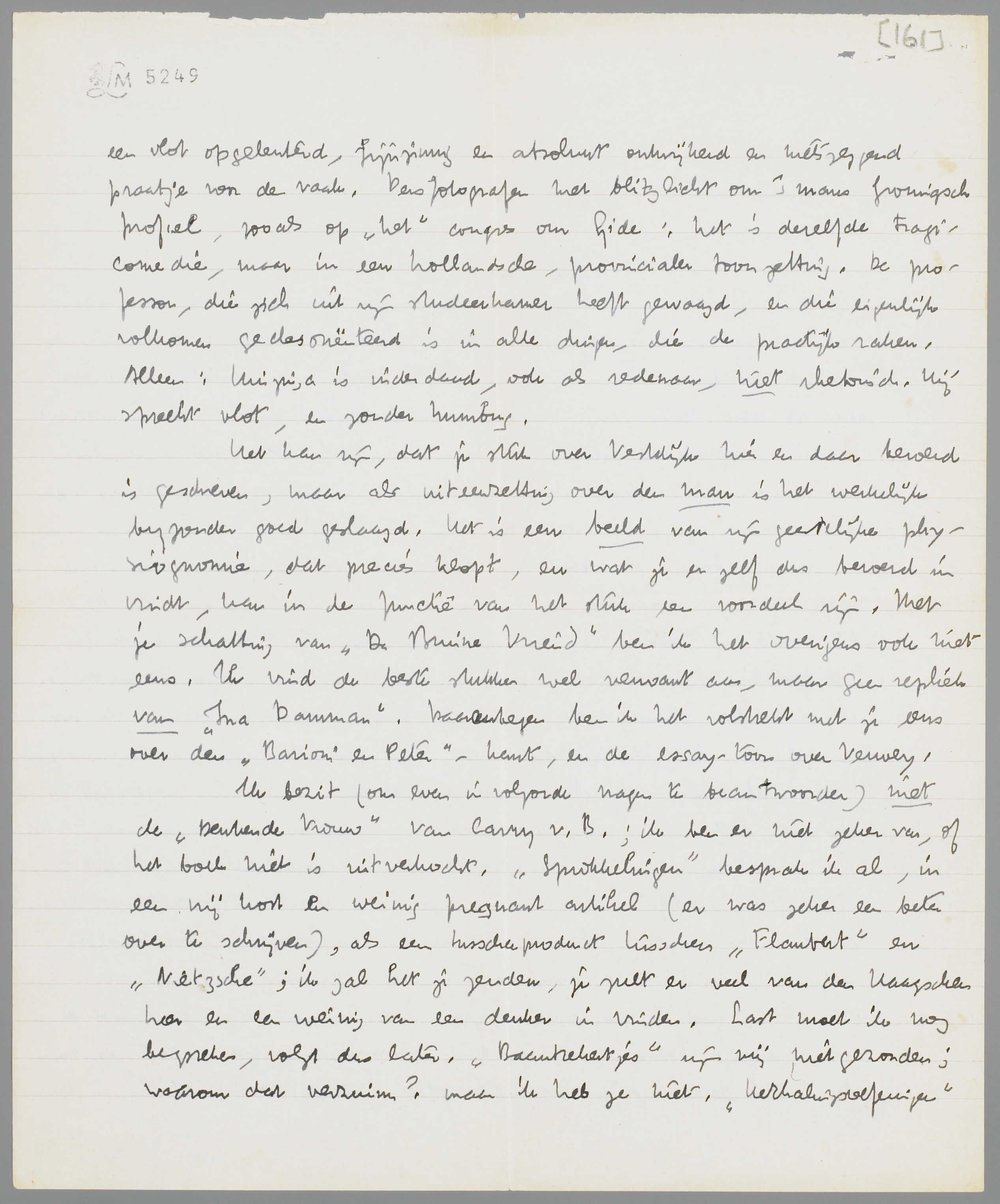 Het kan zijn, dat je stuk over Vestdijk hier en daar beroerd is geschreven, maar als uiteenzetting over de man is het werkelijk bijzonder goed geslaagd. Het is een beeld van zijn geestelijke physiognomie, dat precies klopt, en wat je er zelf dus beroerd in vindt, kan in de functie van het stuk een voordeel zijn. Met je schatting van De Bruine Vriend ben ik het overigens ook niet eens. Ik vind de beste stukken wel verwant aan, maar geen repliek van Ina Damman. Daarentegen ben ik het volstrekt met je eens over den Barioni en Peter-kant, en de essay-toon over Verwey.