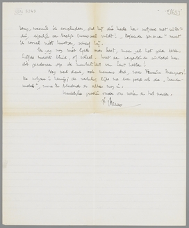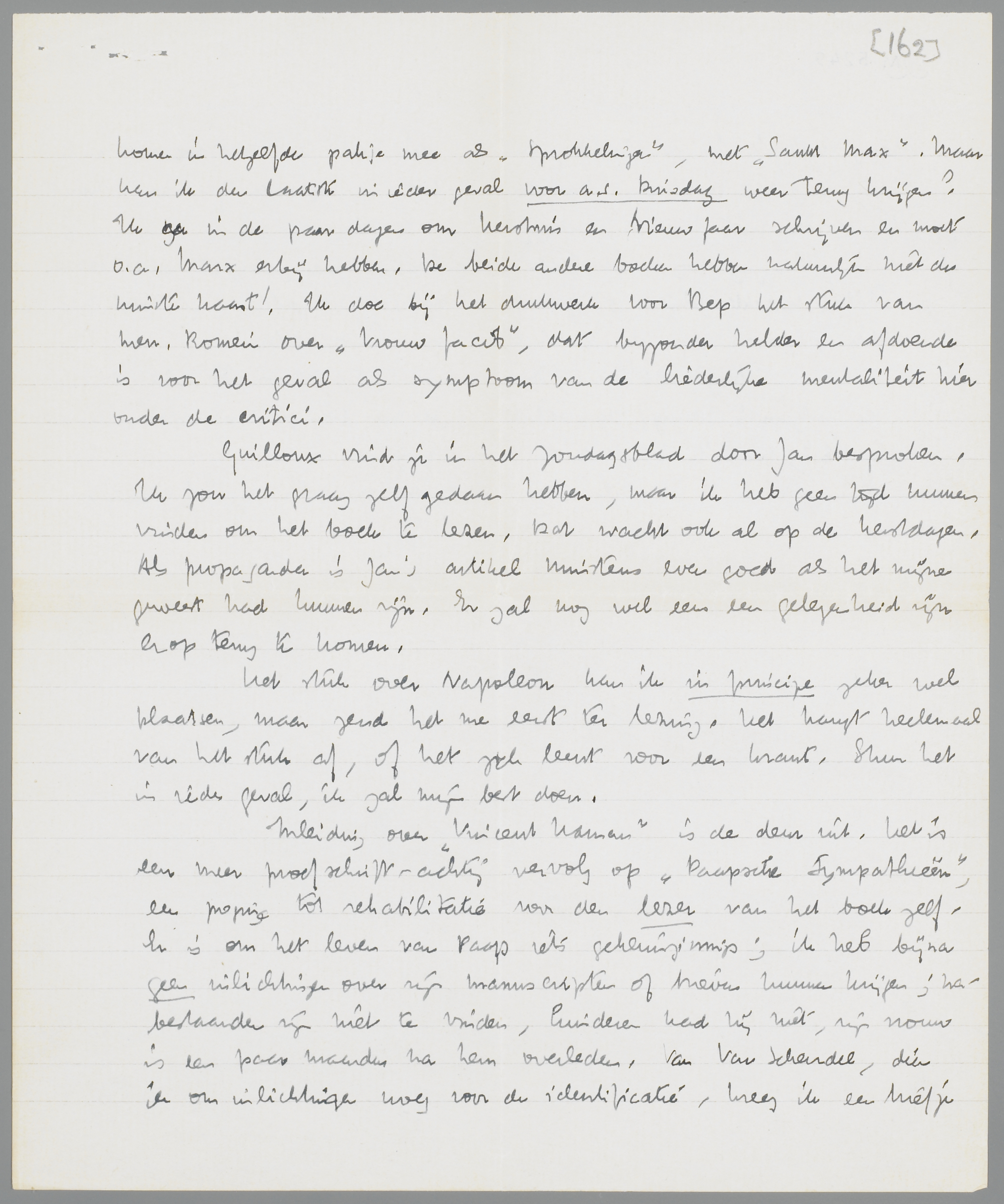 Ik bezit (om even in volgorde vragen te beantwoorden) niet de Denkende Vrouw van Carry v.B.; ik ben er niet zeker van, of het boek niet is uitverkocht. Sprokkelingen besprak ik al, in een vrij kort en weinig pregnant artikel (er was zeker een beter over te schrijven), als een tusschenproduct tusschen ‘Flaubert’ en ‘Nietzsche’; ik zal het je zenden, je zult er veel van den Haagschen heer en een weinig van een denker in vinden. Last moet ik nog bespreken, volgt dus later. Baanbrekertjes zijn mij niet gezonden; waarom dat verzuim? maar ik heb ze niet. Herhalingsoefeningen komen in hetzelfde pakje mee als Sprokkelingen, met Sankt Max. Maar kan ik den laatste in ieder geval voor a.s. Dinsdag weer terug krijgen? Ik ga in de paar dagen om Kerstmis en Nieuwjaar schrijven en moet o.a. Marx erbij hebben. De beide andere boeken hebben natuurlijk niet de minste haast! Ik doe bij het drukwerk voor Bep het stuk van mevr. Romein over Vrouw Jacob, dat bijzonder helder en afdoende is voor het geval als symptoom van de liederlijke mentaliteit hier onder de critici.