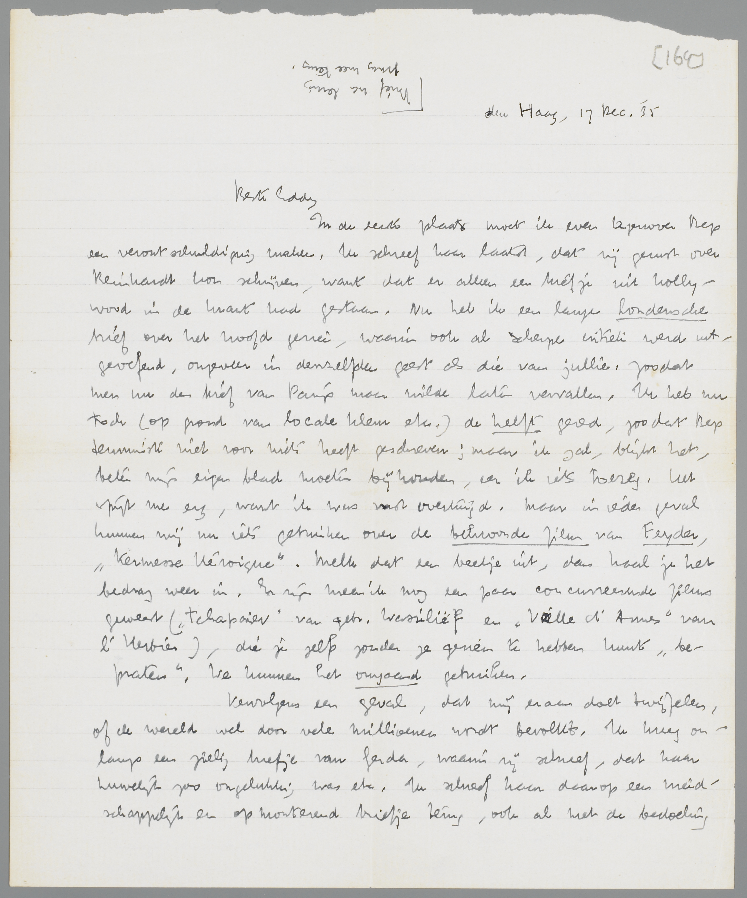In de eerste plaats moet ik even tegenover Bep een verontschuldiging maken. Ik schreef haar laatst, dat zij gerust over Reinhardt kon schrijven, want dat er alleen een briefje uit Hollywood in de krant had gestaan. Nu heb ik een lange Londensche brief over het hoofd gezien, waarin ook al scherpe critiek werd uitgeoefend, ongeveer in denzelfden geest als die van jullie. Zoodat men nu den brief van Parijs maar wilde laten vervallen. Ik heb nu toch (op grond van locale kleur etc.) de helft gered, zoodat Bep tenminste niet voor niets heeft geschreven; maar ik zal, blijkt het, beter mijn eigen blad moeten bijhouden, eer ik iets toezeg. Het spijt me erg, want ik was vast overtuigd. Maar in ieder geval kunnen wij nu iets gebruiken over de bekroonde film van Feyder, Kermesse Héroïque. Melk dat een beetje uit, dan haal je het bedrag weer in. Er zijn meen ik nog een paar concurreerende films geweest (Tchapaiev van gebr. Wassiliëf en Veille d'Armes van l'Herbier), die je zelfs zonder ze gezien te hebben kunt ‘bepraten’. We kunnen het omgaand gebruiken.