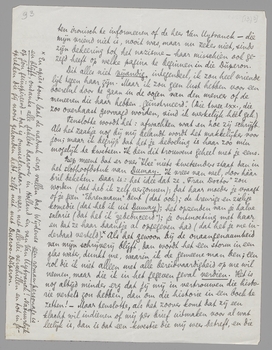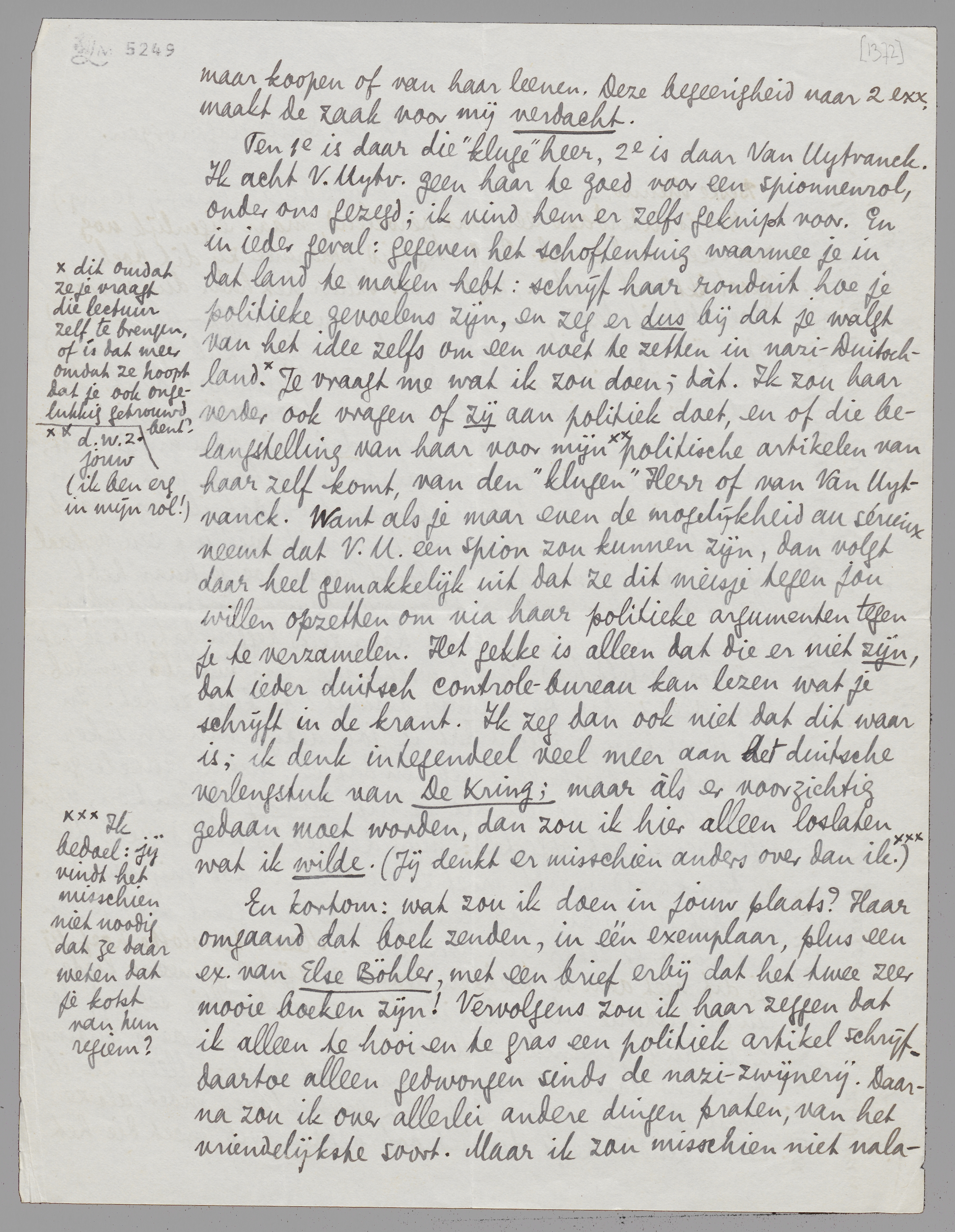 Ten 1e is daar die ‘kluge’ heer, 2e is daar Van Uytvanck. Ik acht V. Uytv. geen haar te goed voor een spionnenrol, onder ons gezegd; ik vind hem er zelfs geknipt voor. En in ieder geval: gegeven het schoftentuig waarmee je in dat land te maken hebt: schrijf haar ronduit hoe je politieke gevoelens zijn, en zeg er dus bij dat je walgt van het idee zelfs om een voet te zetten in nazi-Duitschland [dit omdat ze je vraagt die lectuur zelf te brengen, of is dat meer omdat ze hoopt dat je ook ongelukkig getrouwd bent?]. Je vraagt me wat ik zou doen; dàt. Ik zou haar verder ook vragen of zij aan politiek doet, en of die belangstelling van haar voor mijn, d.w.z. jouw (ik ben erg in mijn rol!), politische artikelen van haar zelf komt, van den ‘klugen’ Herr of van Van Uytvanck. Want als je maar even de mogelijkheid au sérieux neemt dat V.U. een spion zou kunnen zijn, dan volgt daar heel gemakkelijk uit dat ze dit meisje tegen jou willen opzetten om via haar politieke argumenten tegen je te verzamelen. Het gekke is alleen dat die er niet zijn, dat ieder duitsch controlebureau kan lezen wat je schrijft in de krant. Ik zeg dan ook niet dat dit waar is; ik denk integendeel veel meer aan het duitsche verlengstuk van De Kring; maar àls er voorzichtig gedaan moet worden, dan zou ik hier alleen loslaten wat ik wilde. (Jij denkt er misschien anders over dan ik.) [Ik bedoel: jij vindt het misschien niet noodig dat ze daar weten dat je kotst van hun regiem?]
