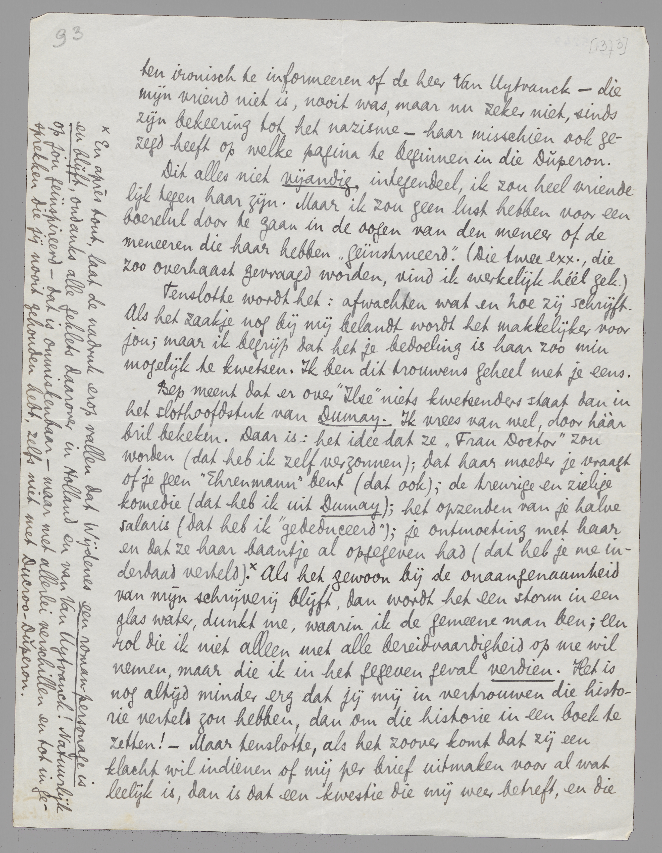 En kortom: wat zou ik doen in jouw plaats? Haar omgaand dat boek zenden, in één exemplaar, plus een ex. van Else Böhler, met een brief erbij dat het twee zeer mooie boeken zijn! Vervolgens zou ik haar zeggen dat ik alleen te hooi en te gras een politiek artikel schrijf. Daartoe alleen gedwongen sinds de nazi-zwijnerij. Daarna zou ik over allerlei andere dingen praten, van het vriendelijkste soort. Maar ik zou misschien niet nalaten ironisch te informeeren of de heer Van Uytvanck - die mijn vriend niet is, nooit was, maar nu zeker niet, sinds zijn bekeering tot het nazisme - haar misschien ook gezegd heeft op welke pagina te beginnen in Dúperon.
