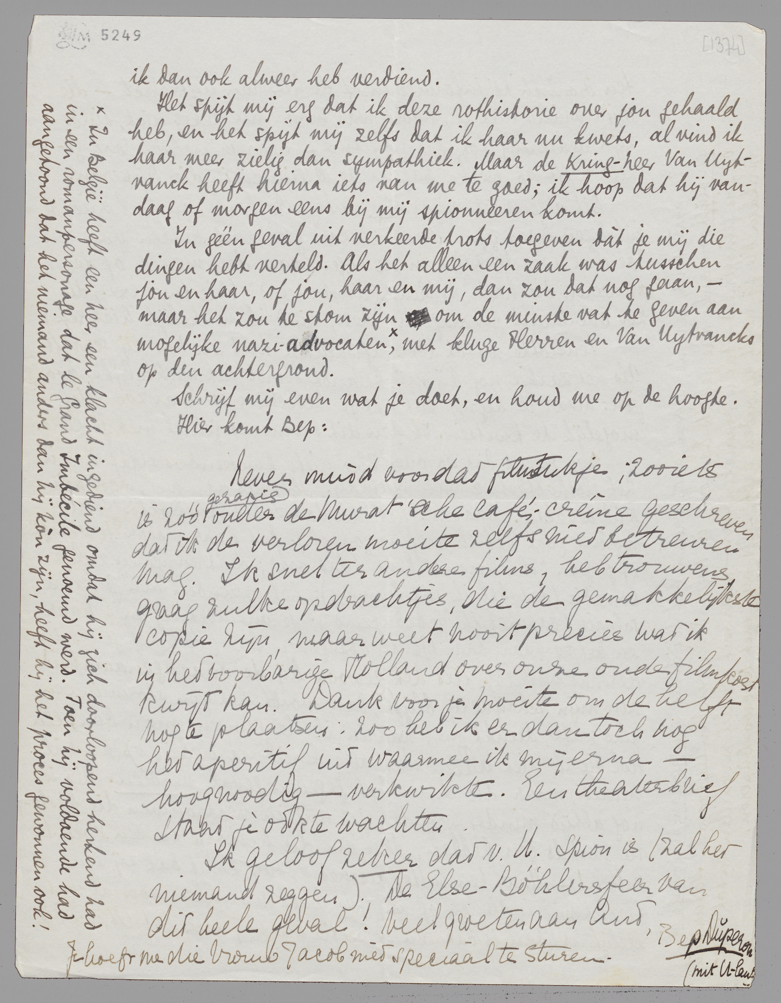 Ik geloof zeker dat v. U. spion is (zal het niemand zeggen). De Else-Böhlersfeer van dit heele geval! Veel groeten aan Ant, Bep Dŭperon (mit U-laut)