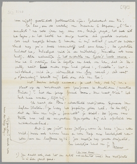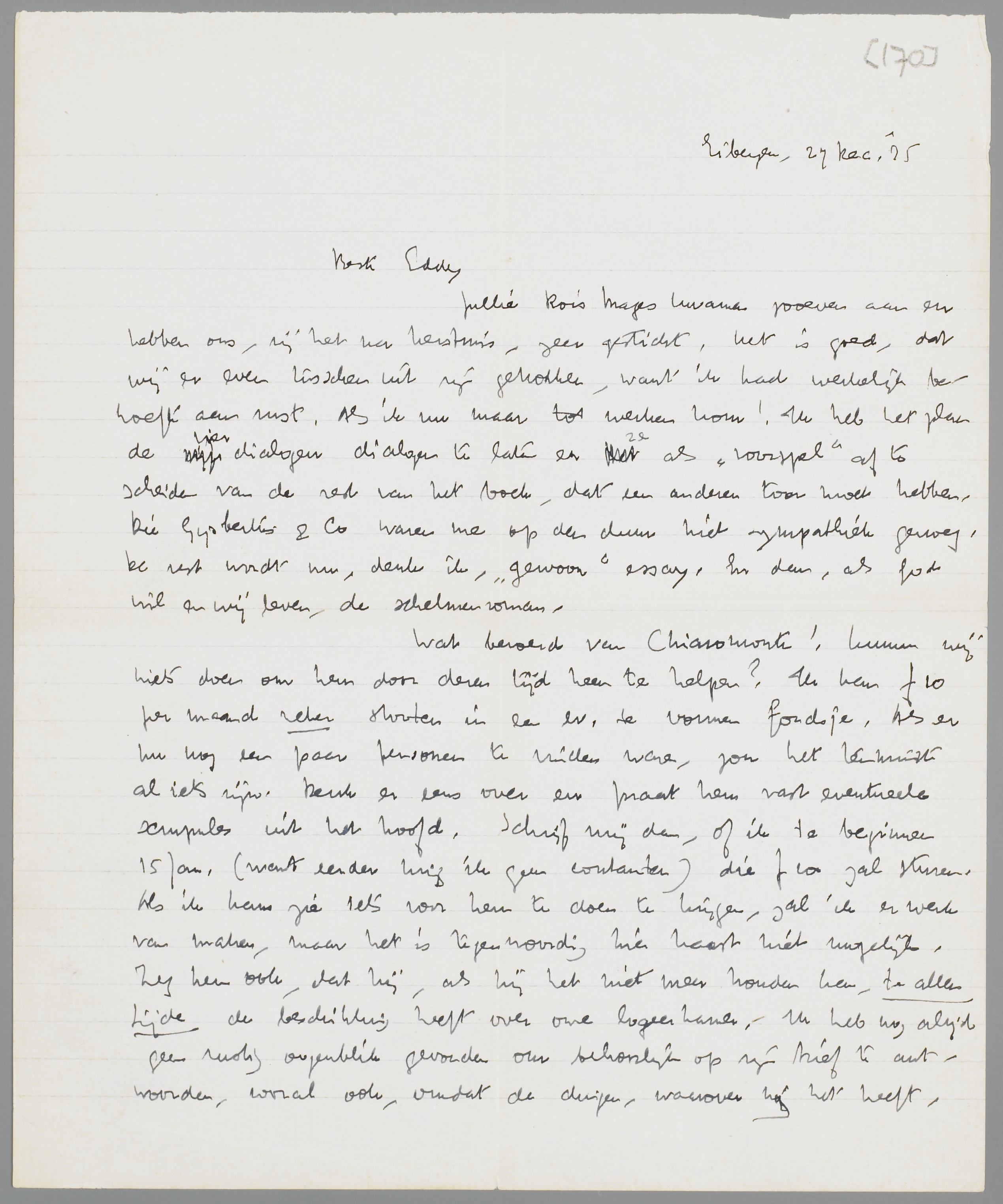 Wat beroerd van Chiaromonte! Kunnen wij niets doen om hem door dezen tijd heen te helpen? Ik kan f 10 per maand zeker storten in een ev. te vormen fondsje. Als er nu nog een paar personen te vinden waren, zou het tenminste al iets zijn. Denk er eens over en praat hem vast eventueele scrupules uit het hoofd. Schrijf mij dan, of ik te beginnen 15 Jan. (want eerder krijg ik geen contanten) die f 10 zal sturen. Als ik kans zie iets voor hem te doen te krijgen, zal ik er werk van maken, maar het is tegenwoordig hier haast niet mogelijk. Zeg hem ook, dat hij, als hij het niet meer houden kan, te allen tijde de beschikking heeft over onze logeerkamer. Ik heb nog altijd geen rustig oogenblik gevonden om behoorlijk op zijn brief te antwoorden, vooral ook, omdat de dingen, waarover hij het heeft, voor mijzelf grootendeels problematisch zijn. Gelukwensch aan Pia!