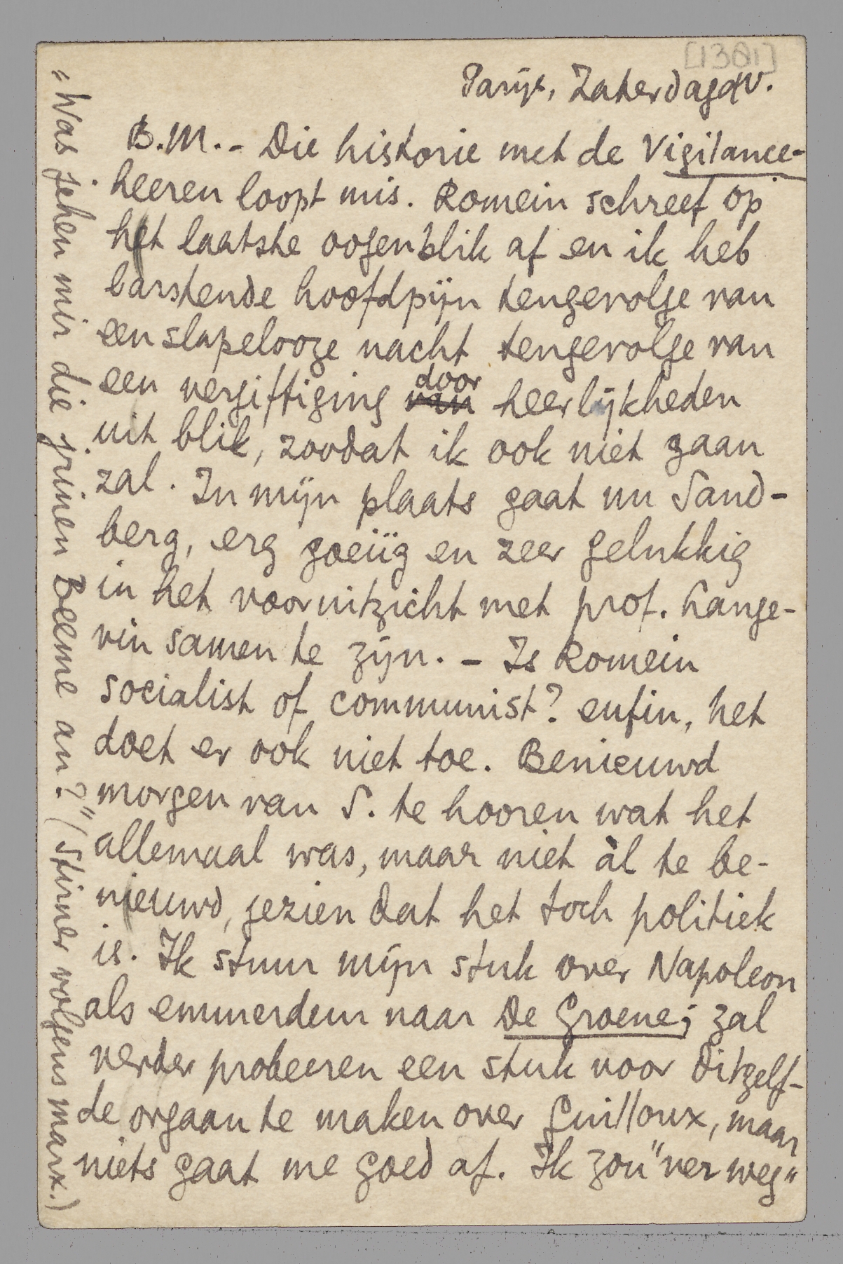 - Die historie met de Vigilance-heeren loopt mis. Romein schreef op het laatste oogenblik af en ik heb barstende hoofdpijn tengevolge van een slapelooze nacht tengevolge van een vergiftiging door heerlijkheden uit blik, zoodat ik ook niet gaan zal. In mijn plaats gaat nu Sandberg, erg goeiïg en zeer gelukkig in het vooruitzicht met prof. Langevin samen te zijn. - Is Romein socialist of communist? enfin, het doet er ook niet toe. Benieuwd morgen van S. te hooren wat het allemaal was, maar niet ál te benieuwd, gezien dat het toch politiek is. Ik stuur mijn stuk over Napoleon als emmerdeur naar De Groene; zal verder probeeren een stuk voor ditzelfde orgaan te maken over Guilloux, maar niets gaat me goed af. Ik zou ‘ver weg’ willen zijn, al weet ik niet waar. Lees met moeite de Odyssee (ben erg suf) en bereid me voor op Hesiodus. - Dank voor je goede wil inzake die artikelen van me. Het kan me alles eig. niets schelen; wel zou ik graag Romein ontmoet hebben. Het beste met je dialogen; waarom ook niet doorgaan daarmee, nu je er 4 klaar hebt? Chiaro heb ik ingelicht; hij was zeer getroffen. Ik schrijf daar nader over. Hartelijk je