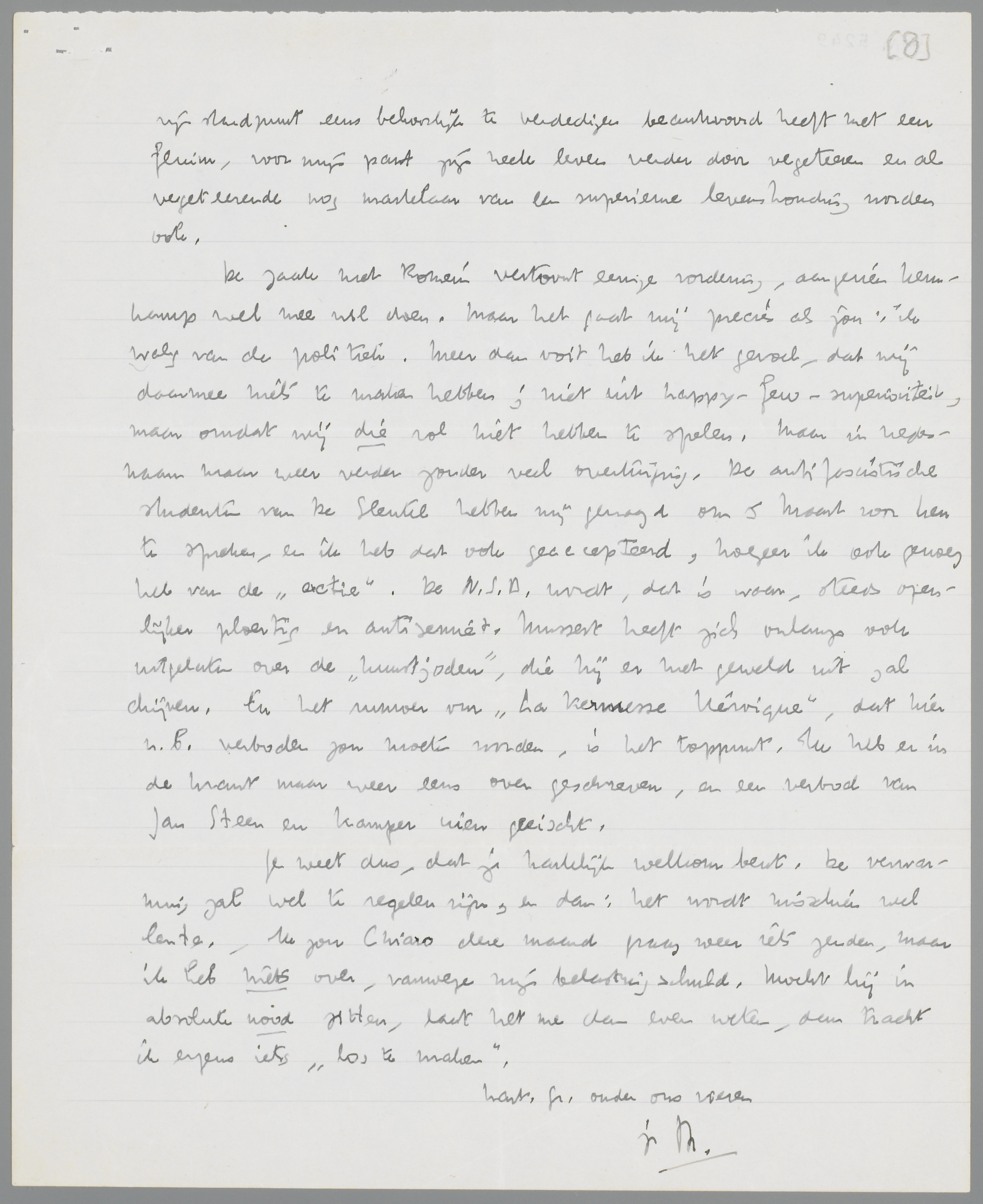 De zaak met Romein vertoont eenige vordering, aangezien Kernkamp wel mee wil doen. Maar het gaat mij precies als jou: ik walg van de politiek. Meer dan ooit heb ik het gevoel, dat wij daarmee niets te maken hebben; niet uit happy-few-superioriteit, maar omdat wij die rol niet hebben te spelen. Maar in vredesnaam maar weer verder zonder veel overtuiging. De antifascistische studenten van De Sleutel hebben mij gevraagd om 5 Maart voor hen te spreken, en ik heb dat ook geaccepteerd, hoezeer ik ook genoeg heb van de ‘actie’. De N.S.B. wordt, dat is waar, steeds openlijker ploertig en anti-semiet. Mussert heeft zich onlangs ook uitgelaten over de ‘kunstjoden’, die hij er met geweld uit zal drijven. En het rumoer om La Kermesse Heroïque, dat hier n.b. verboden zou moeten worden, is het toppunt. Ik heb er in de krant maar weer eens over geschreven, en een verbod van Jan Steen en Kamperuien geëischt.