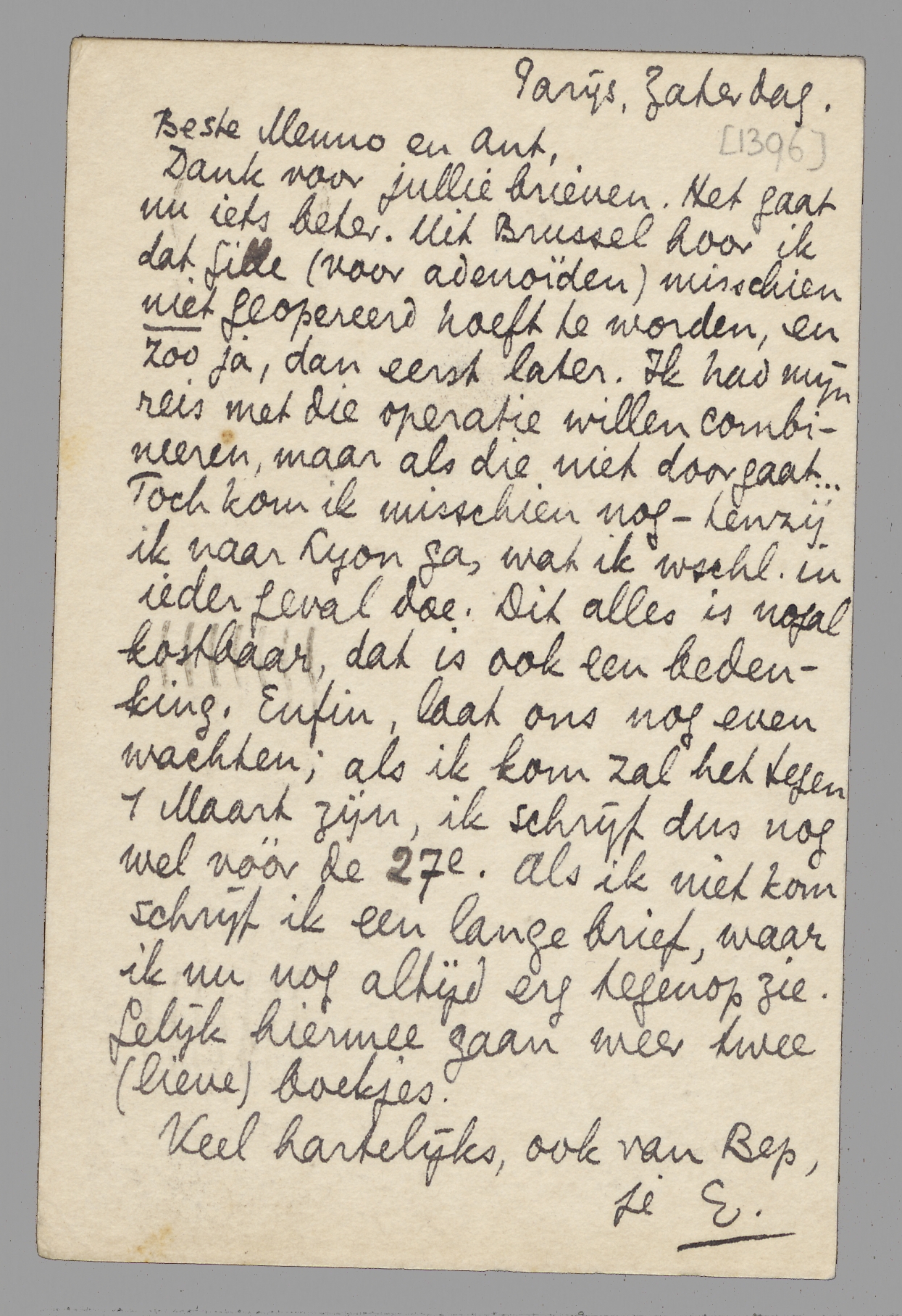 Beste Menno en Ant, Dank voor jullie brieven. Het gaat nu iets beter. Uit Brussel hoor ik dat Gille (voor adenoïden) misschien niet geopereerd hoeft te worden, en zoo ja, dan eerst later. Ik had mijn reis met die operatie willen combineeren, maar als die niet doorgaat...