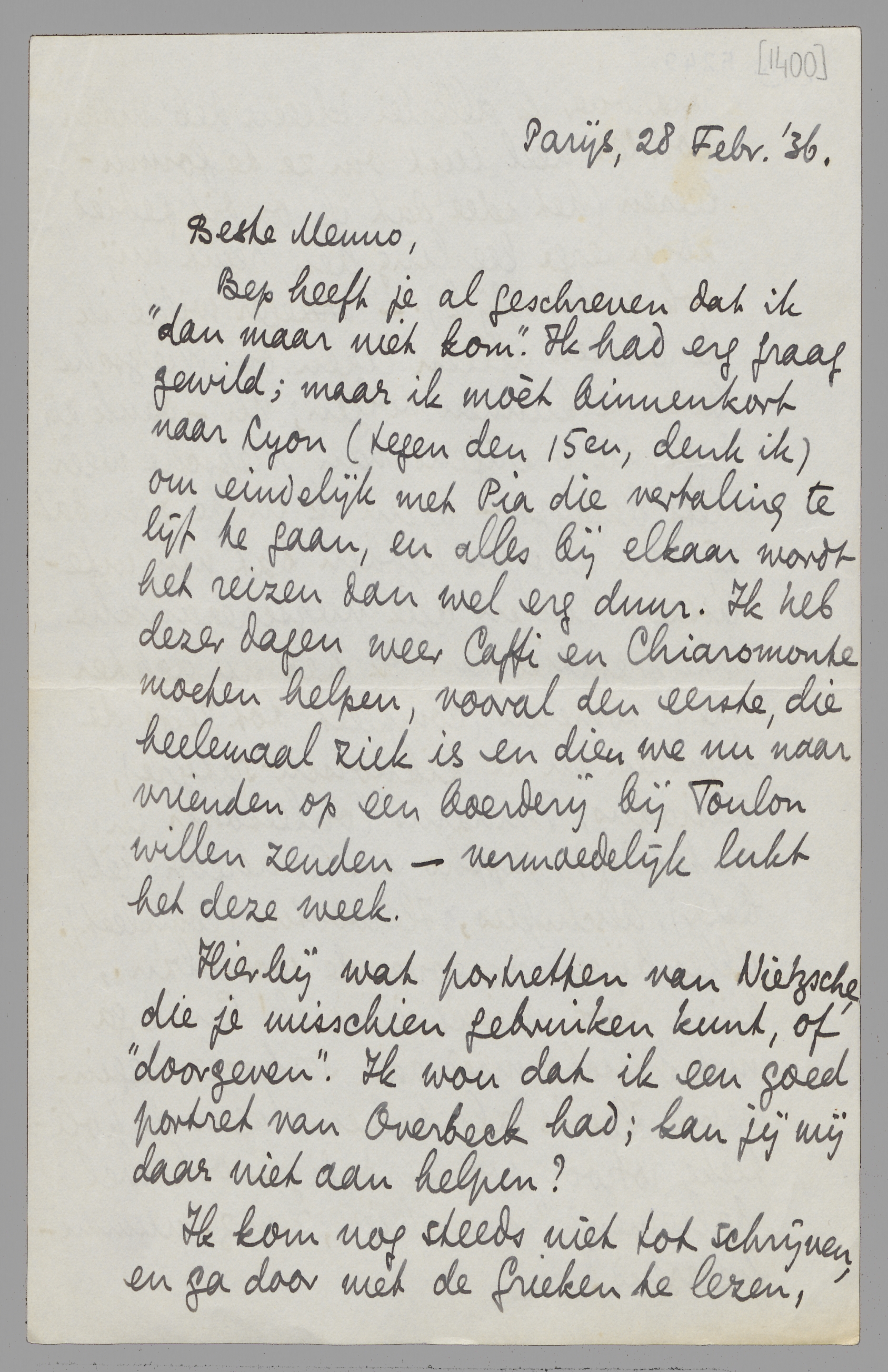 Bep heeft je al geschreven dat ik ‘dan maar niet kom’. Ik had erg graag gewild; maar ik moèt binnenkort naar Lyon (tegen den 15en, denk ik) om eindelijk met Pia die vertaling te lijf te gaan, en alles bij elkaar wordt het reizen dan wel erg duur. Ik heb dezer dagen weer Caffi en Chiaromonte moeten helpen, vooral den eerste, die heelemaal ziek is en dien we nu naar vrienden op een boerderij bij Toulon willen zenden - vermoedelijk lukt het deze week.