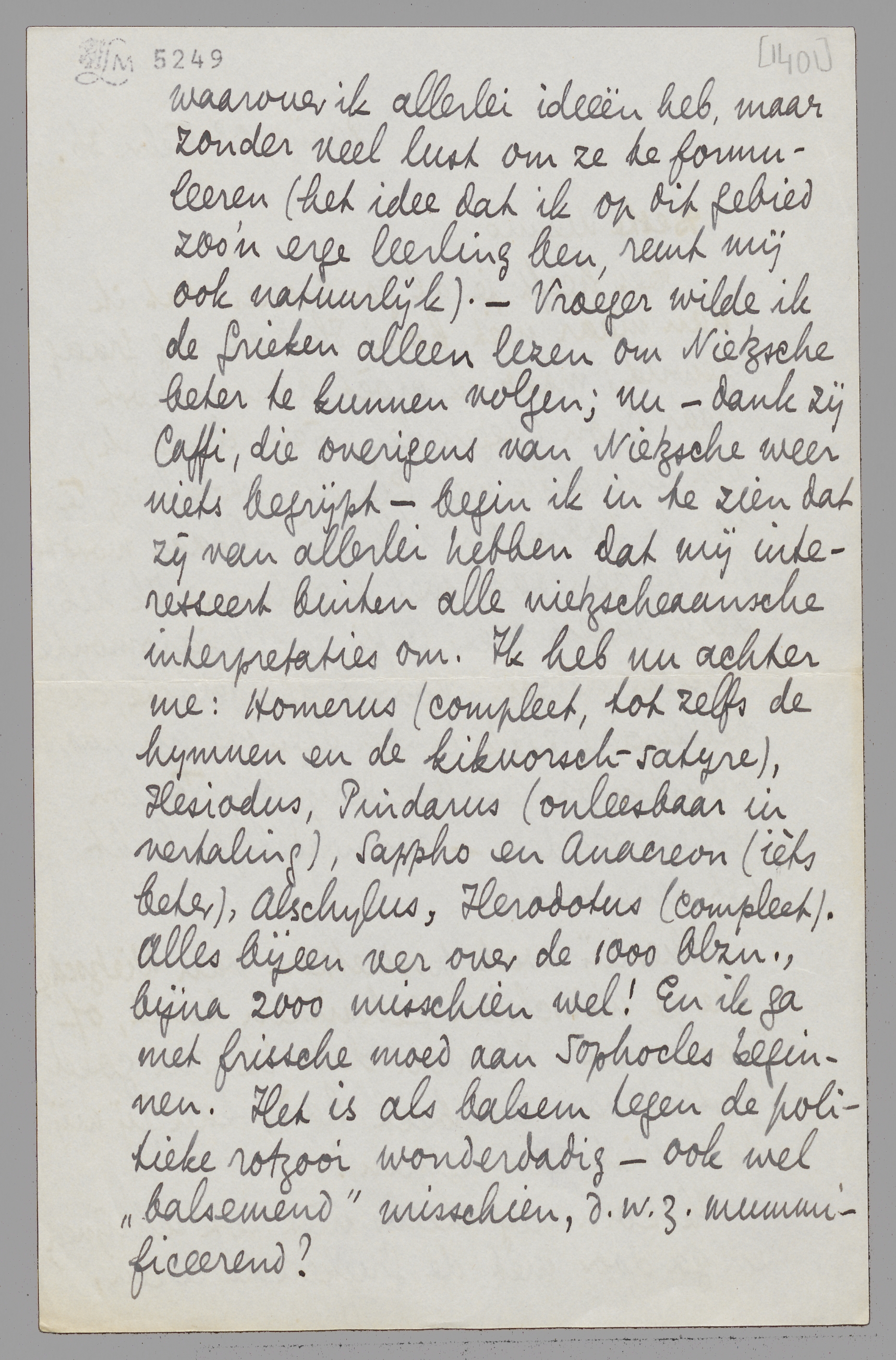 Ik kom nog steeds niet tot schrijven, en ga door met de Grieken te lezen, waarover ik allerlei ideeën heb, maar zonder veel lust om ze te formuleeren (het idee dat ik op dit gebied zoo'n erge leerling ben, remt mij ook natuurlijk). - Vroeger wilde ik de Grieken alleen lezen om Nietzsche beter te kunnen volgen; nu - dank zij Caffi, die overigens van Nietzsche weer niets begrijpt - begin ik in te zien dat zij van allerlei hebben dat mij interesseert buiten alle nietzscheaansche interpretaties om. Ik heb nu achter me: Homerus (compleet, tot zelfs de hymnen en de kikvorschsatyre), Hesiodus, Pindarus (onleesbaar in vertaling), Sappho en Anacreon (iets beter), Aeschylus, Herodotus (compleet). Alles bijeen ver over de 1000 blzn., bijna 2000 misschien wel! En ik ga met frissche moed aan Sophocles beginnen. Het is als balsem tegen de politieke rotzooi wonderdadig - ook wel ‘balsemend’ misschien, d.w.z. mummificeerend?