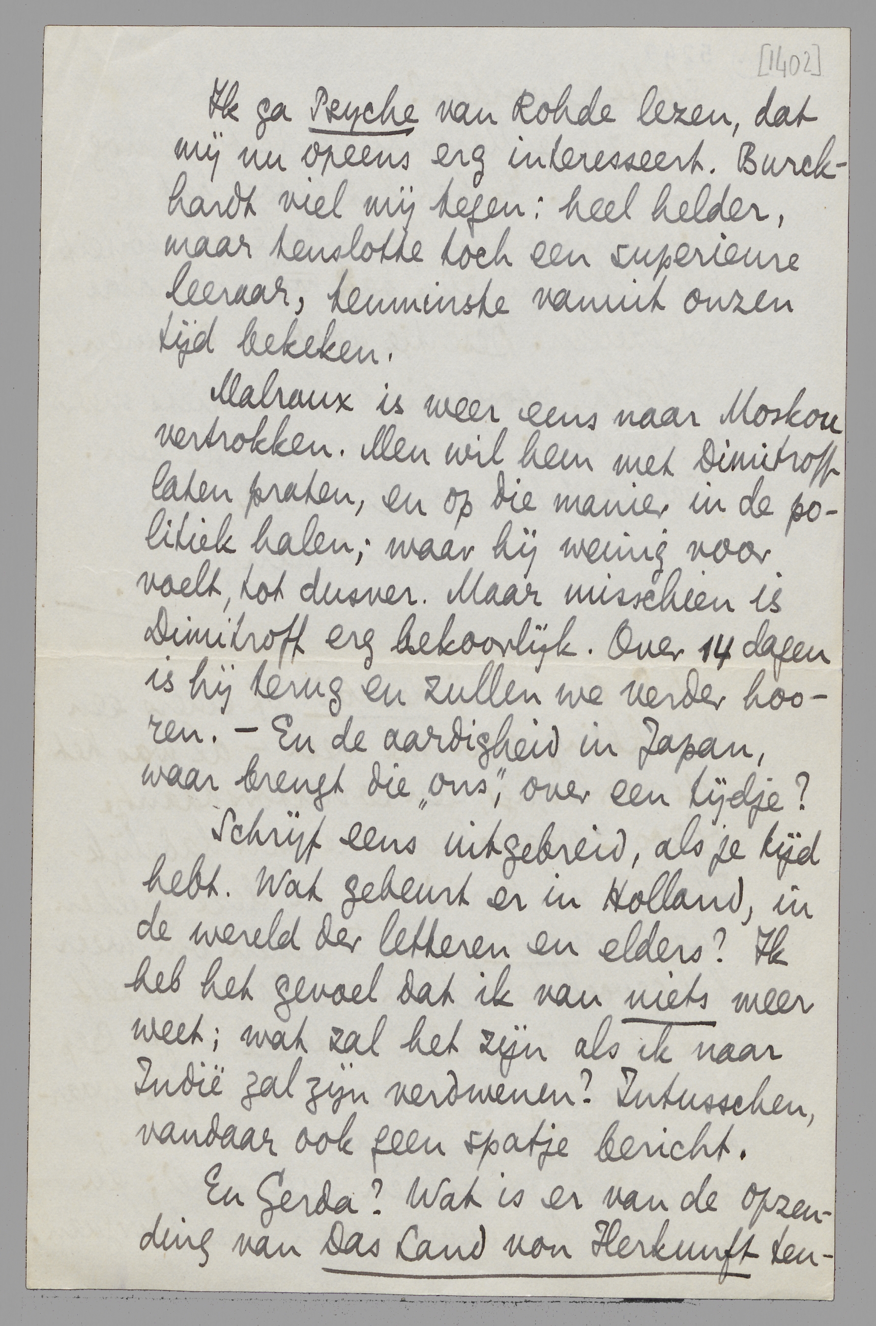 Malraux is weer eens naar Moskou vertrokken. Men wil hem met Dimitroff laten praten, en op die manier in de politiek halen; waar hij weinig voor voelt, tot dusver. Maar misschien is Dimitroff erg bekoorlijk. Over 14 dagen is hij terug en zullen we verder hooren. - En de aardigheid in Japan, waar brengt die ‘ons’, over een tijdje?