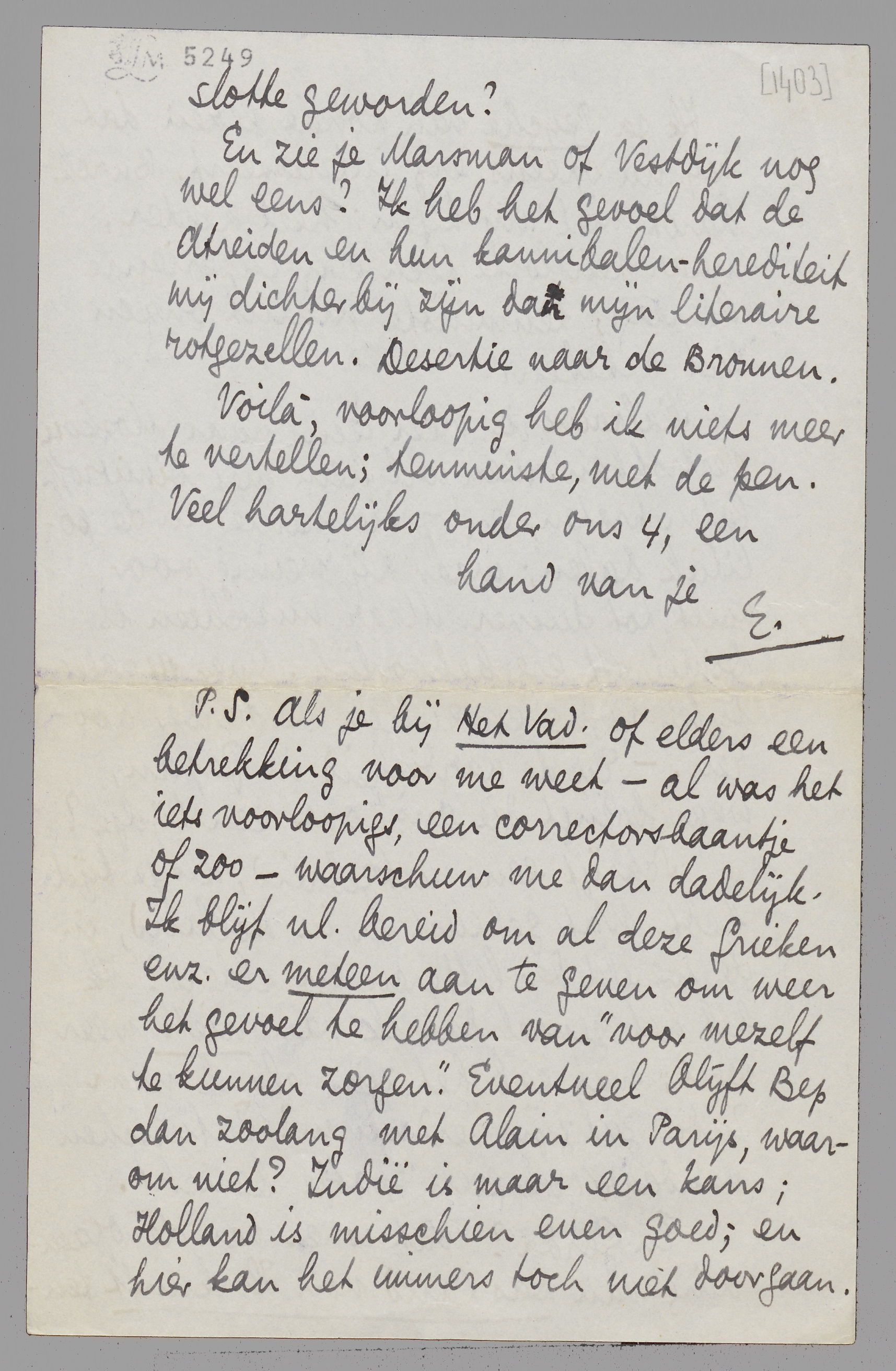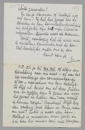 P.S. Als je bij Het Vad. of elders een betrekking voor me weet - al was het iets voorloopigs, een correctorsbaantje of zoo - waarschuw me dan dadelijk. Ik blijf nl. bereid om al deze Grieken enz. er meteen aan te geven om weer het gevoel te hebben van ‘voor mezelf te kunnen zorgen’. Eventueel blijft Bep dan zoolang met Alain in Parijs, waarom niet? Indië is maar een kans; Holland is misschien even goed; en hier kan het immers toch niet doorgaan.